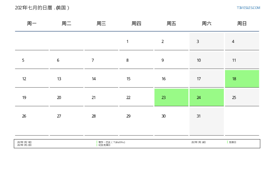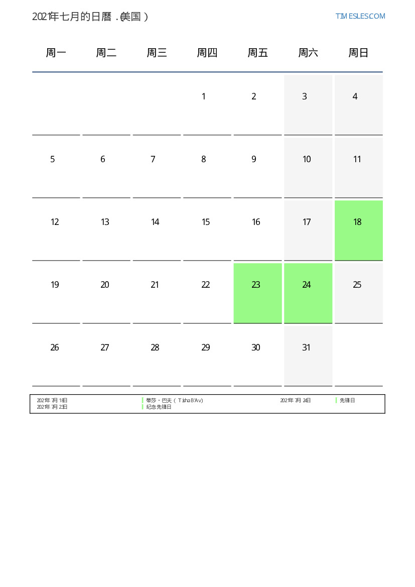 下載並打印2021年七月美国節假日和周末的PDF日曆