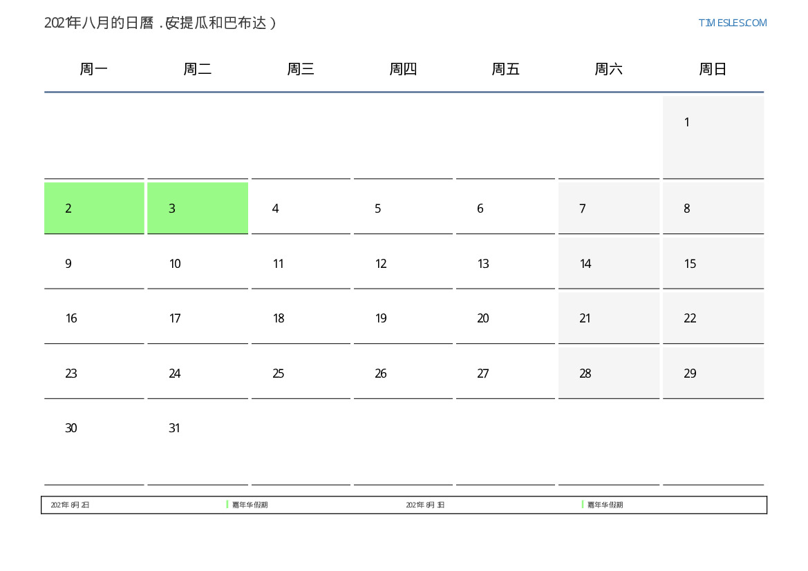 下載並打印2021年八月安提瓜和巴布达節假日和周末的PDF日曆
