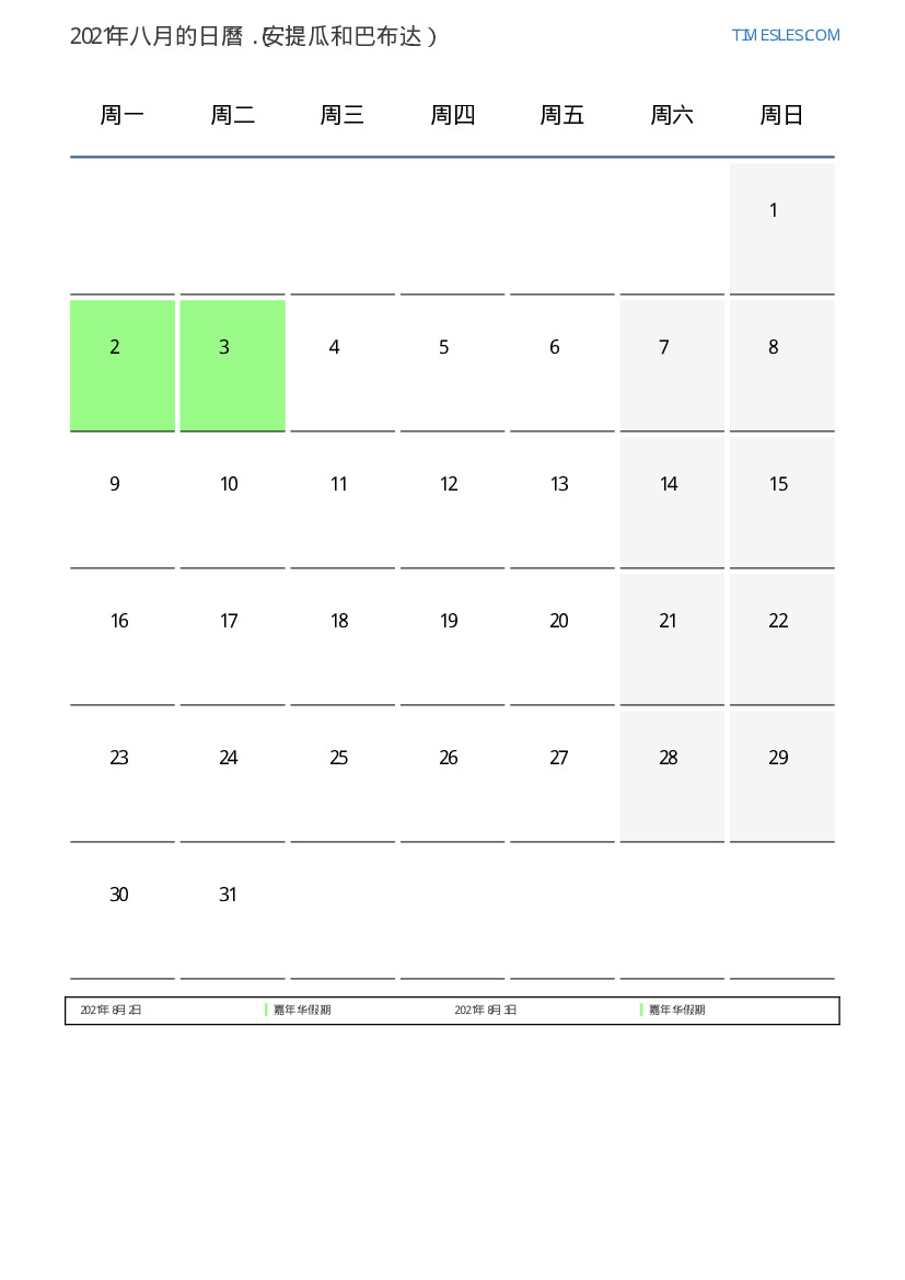 八月包含31天。 這是2021年的8個月。 在2021年八月,在安提瓜和巴布达有2 假期和休假。