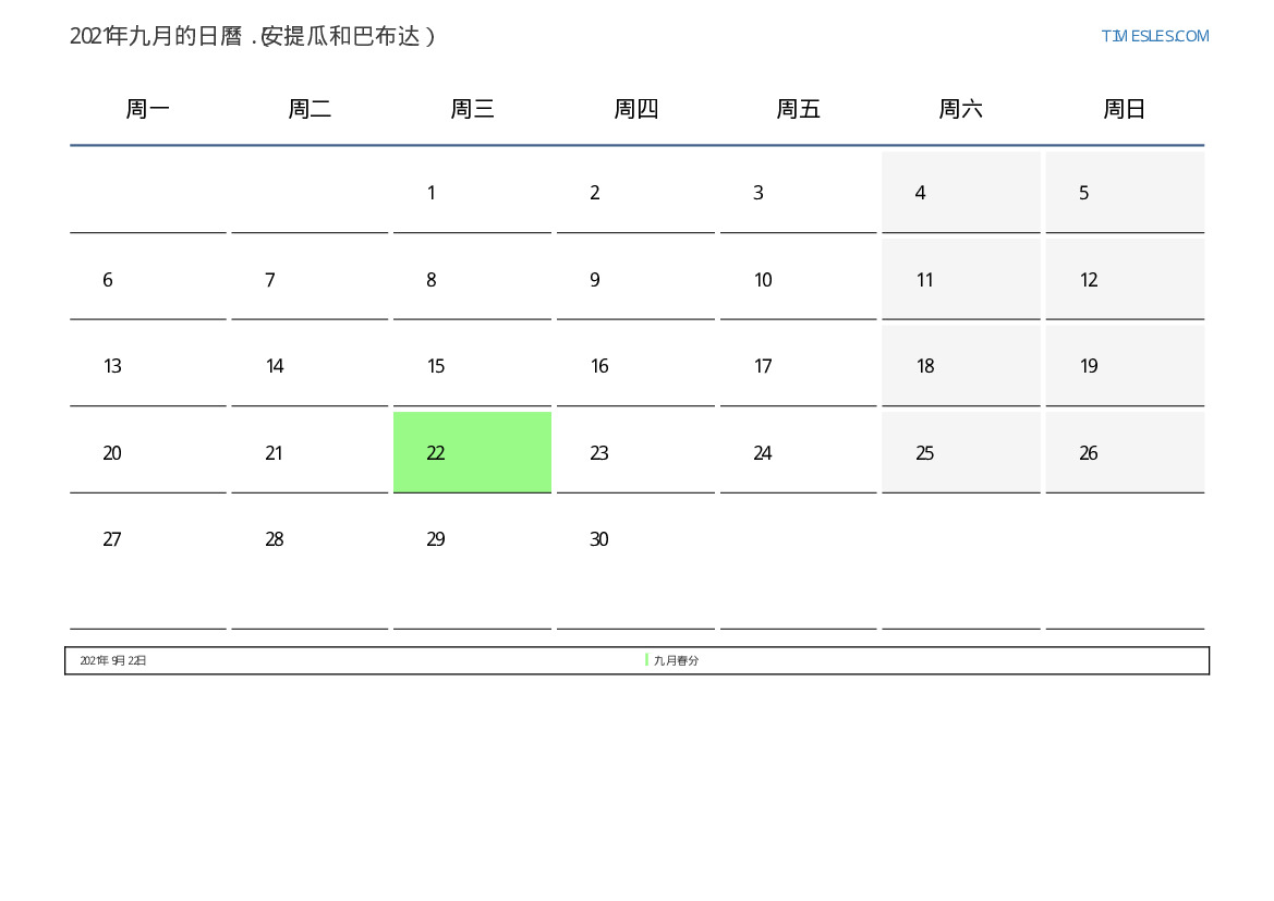 下載並打印2021年九月安提瓜和巴布达節假日和周末的PDF日曆