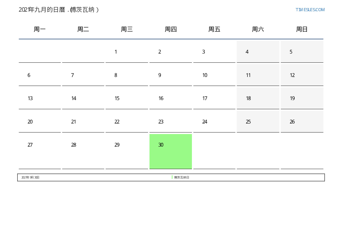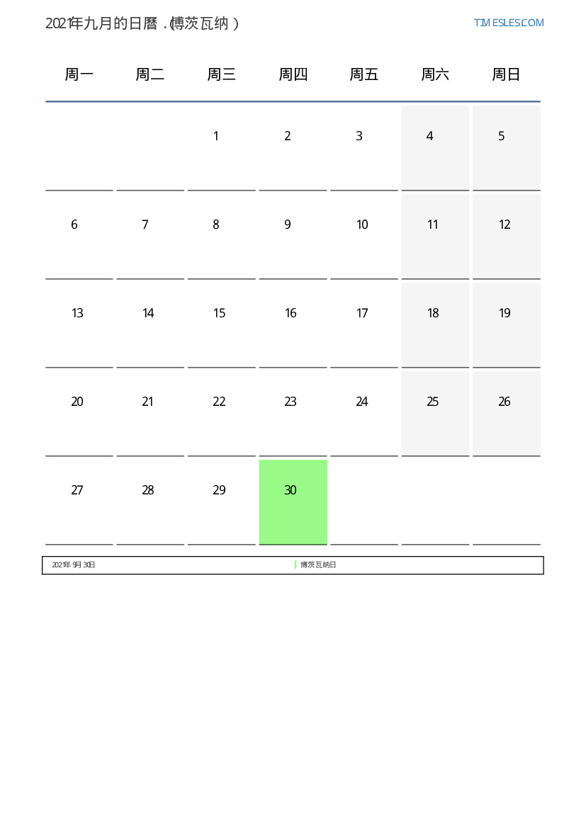 下載並打印2021年九月博茨瓦纳節假日和周末的PDF日曆