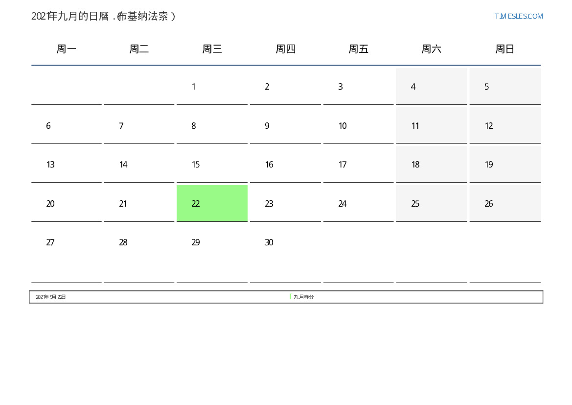 九月包含30天。 這是2021年的9個月。 在2021年九月,在布基纳法索有1 假期和休假。