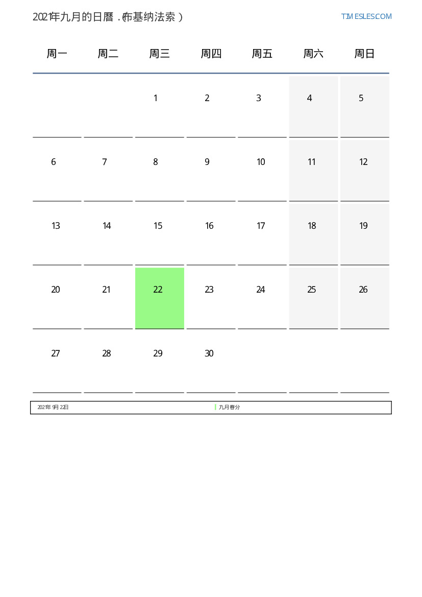 下載並打印2021年九月布基纳法索節假日和周末的PDF日曆