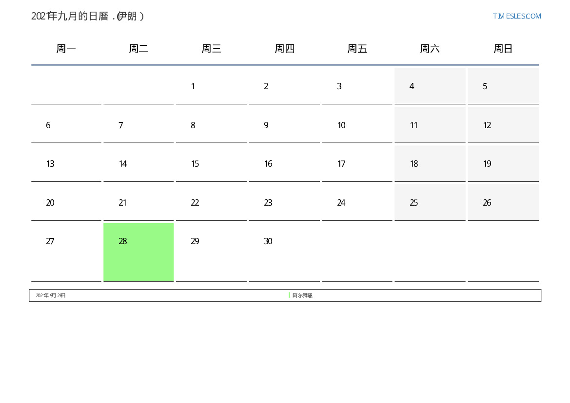 九月包含30天。 這是2021年的9個月。 在2021年九月,在伊朗有2 假期和休假。