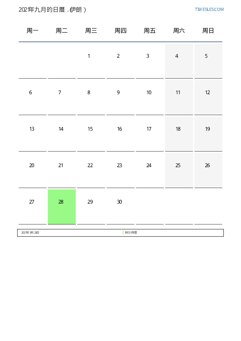 下載並打印2021年九月伊朗節假日和周末的PDF日曆