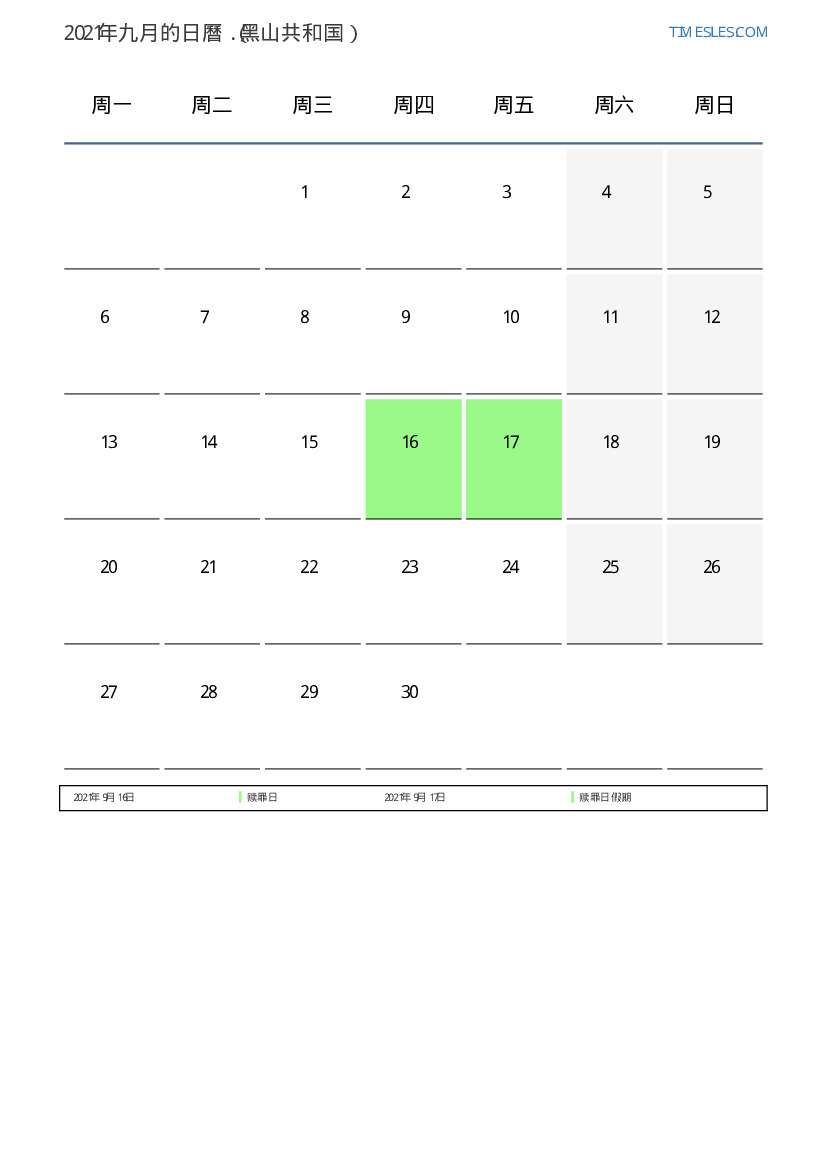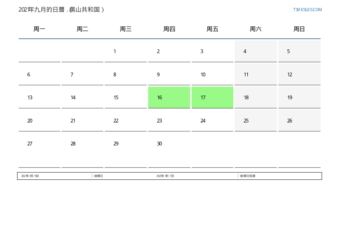 下載並打印2021年九月黑山共和国節假日和周末的PDF日曆