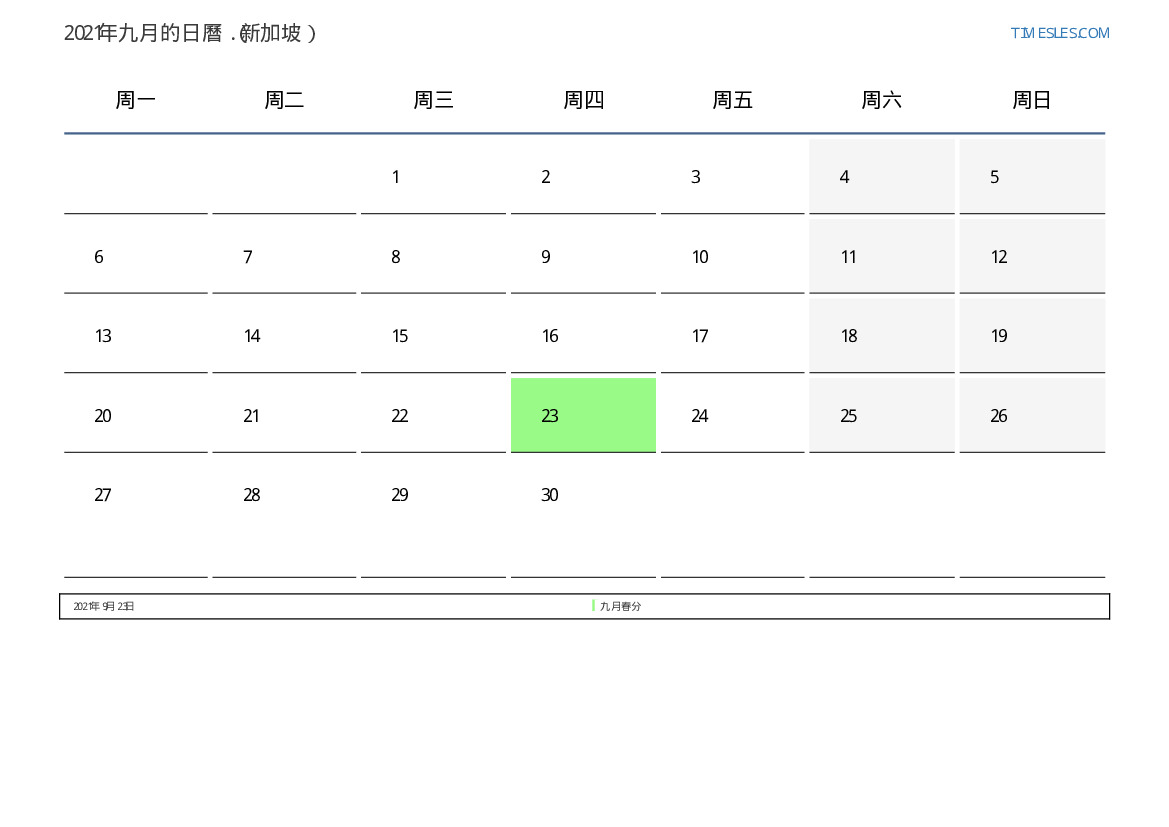 九月包含30天。 這是2021年的9個月。 在2021年九月,在新加坡有1 假期和休假。