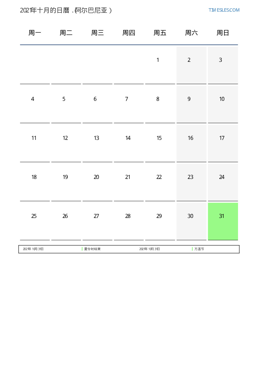 下載並打印2021年十月阿尔巴尼亚節假日和周末的PDF日曆