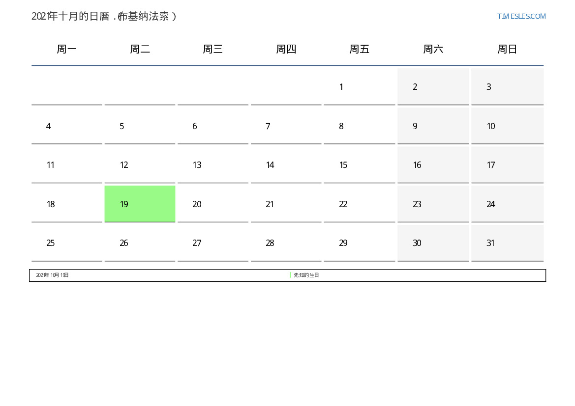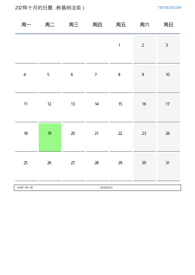 下載並打印2021年十月布基纳法索節假日和周末的PDF日曆