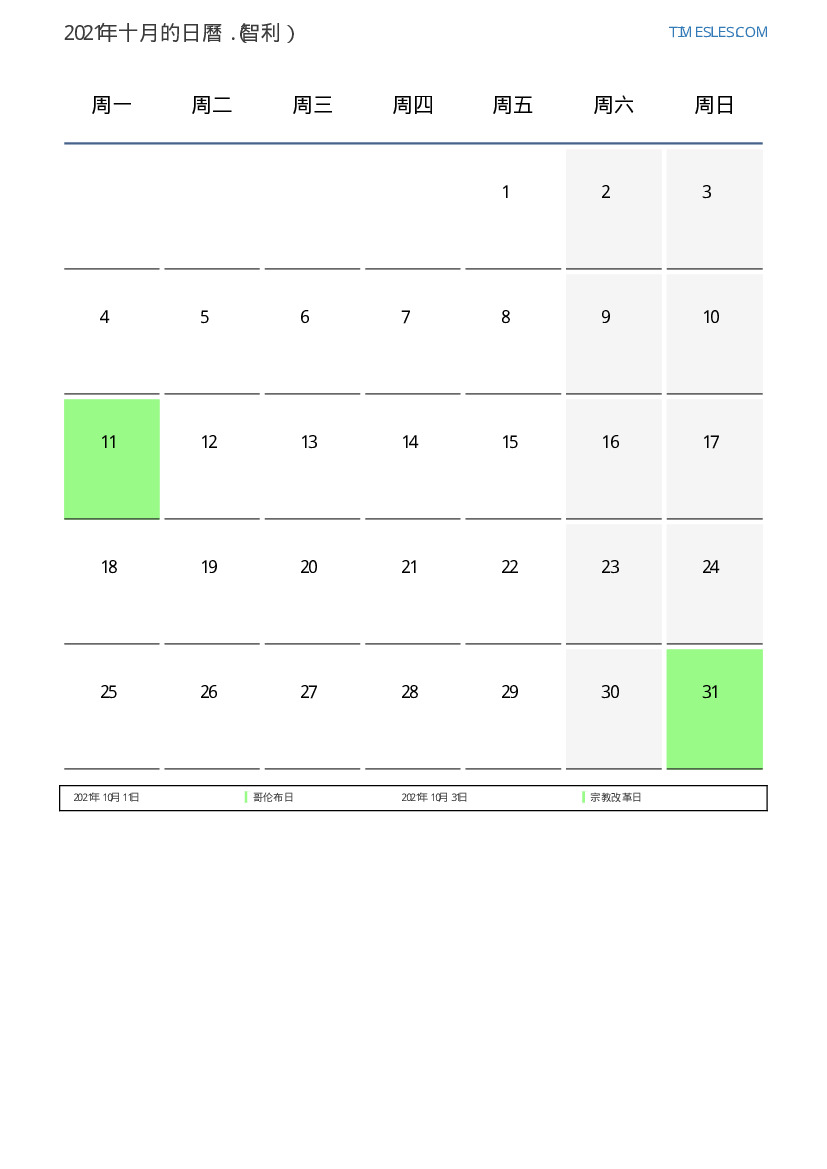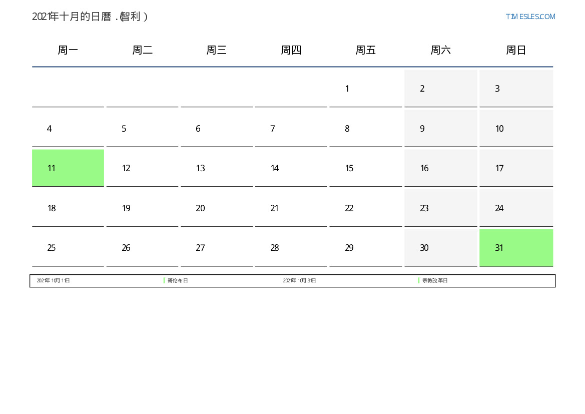 下載並打印2021年十月智利節假日和周末的PDF日曆