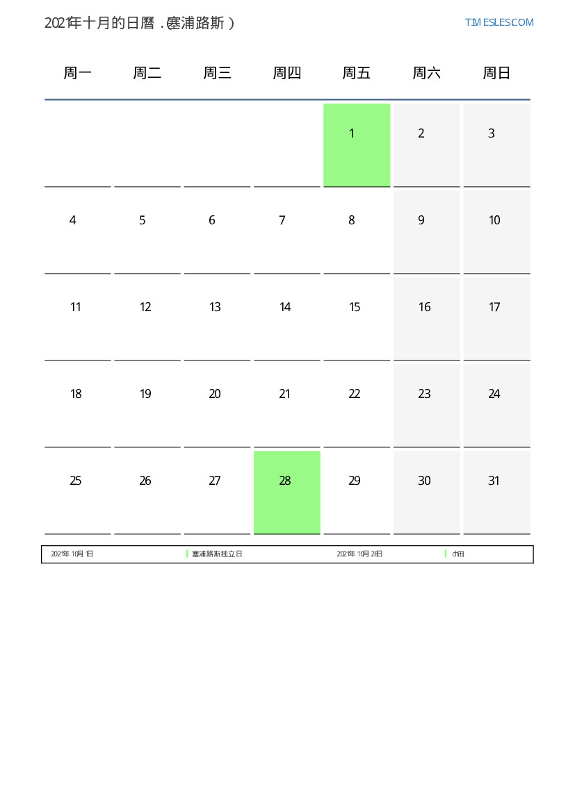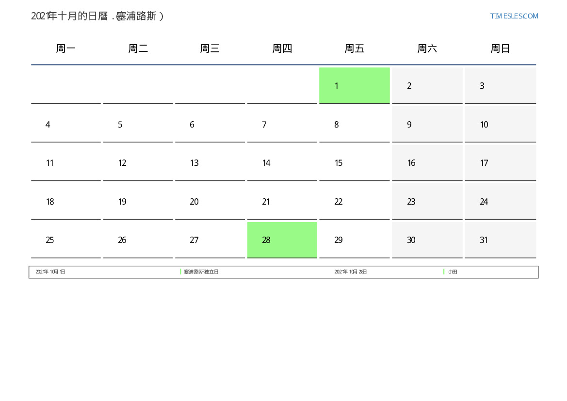 塞浦路斯2021年十月的假期和周末日曆