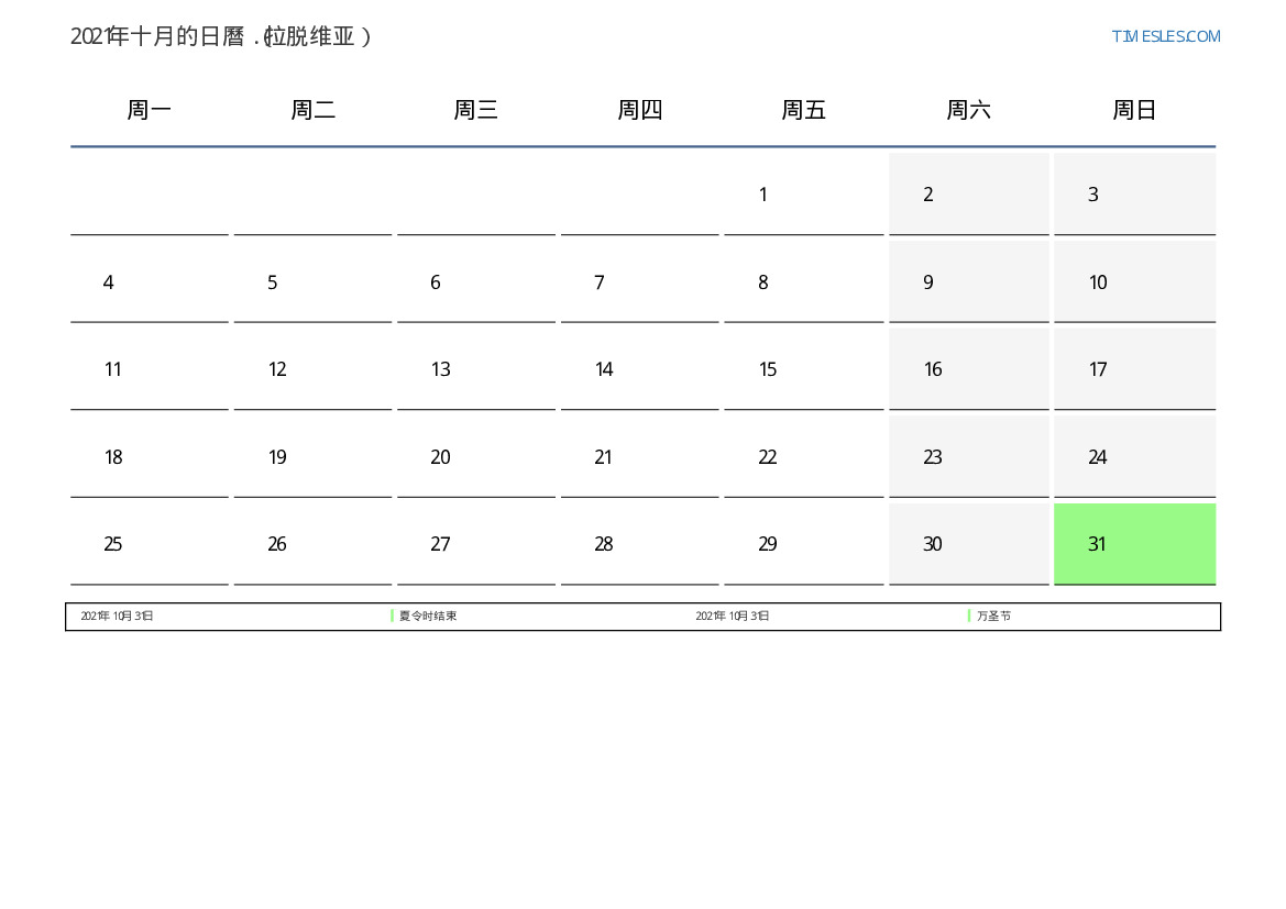 下載並打印2021年十月拉脱维亚節假日和周末的PDF日曆