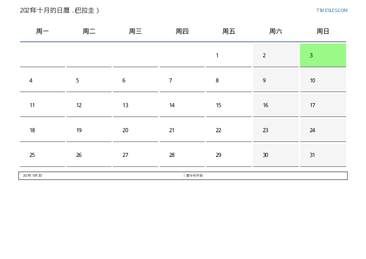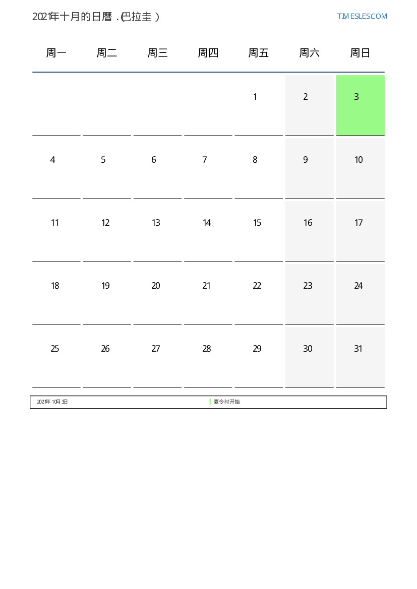 下載並打印2021年十月巴拉圭節假日和周末的PDF日曆