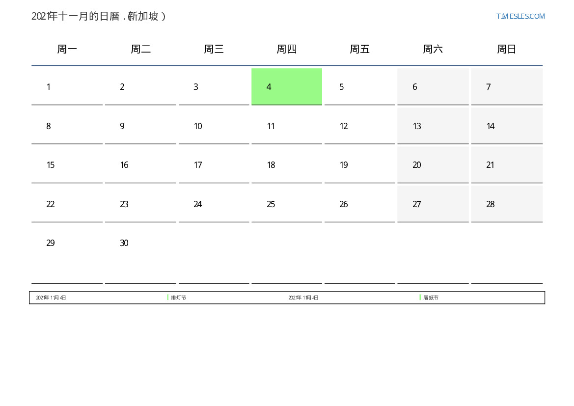 十一月包含30天。 這是2021年的11個月。 在2021年十一月,在新加坡有2 假期和休假。