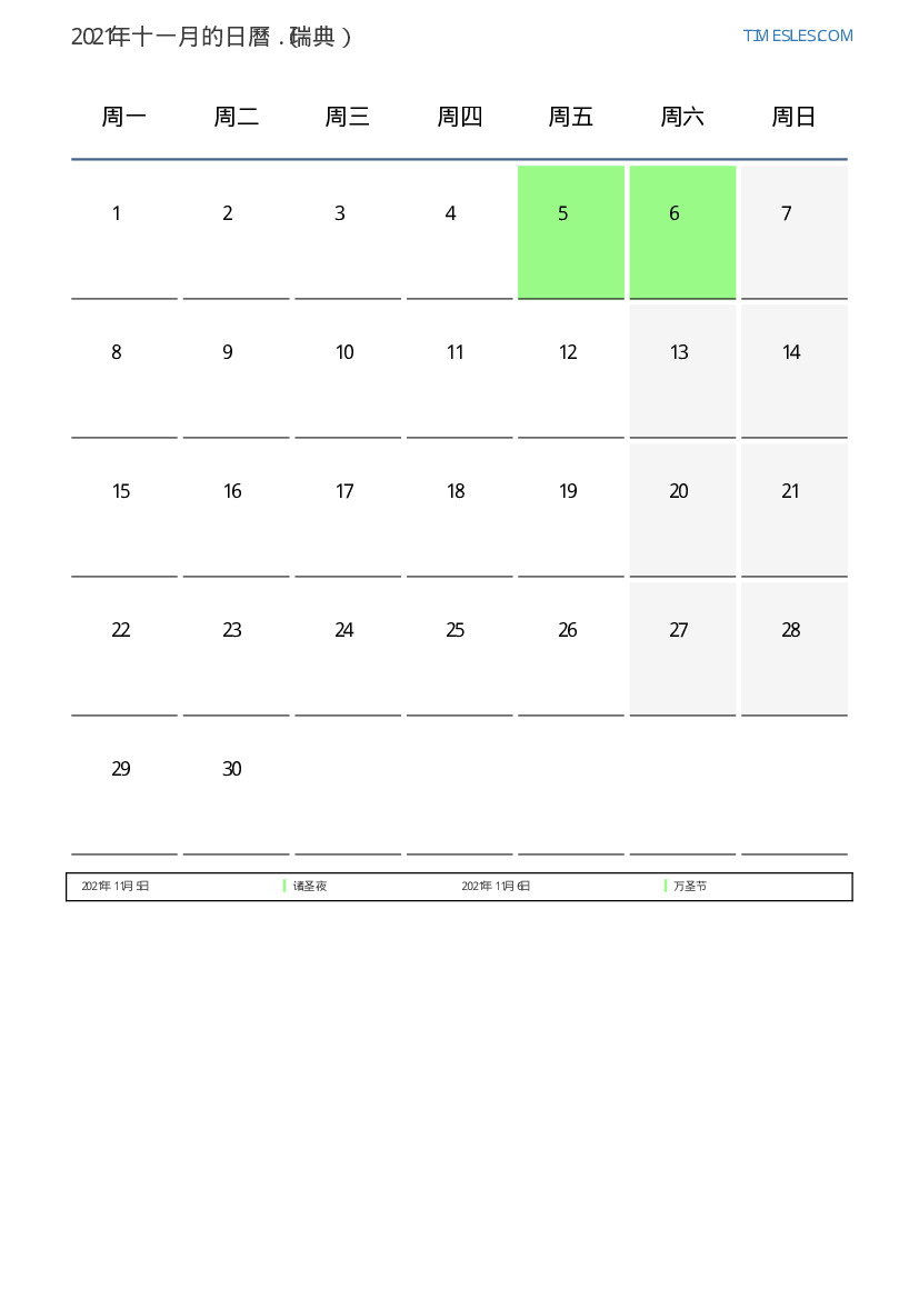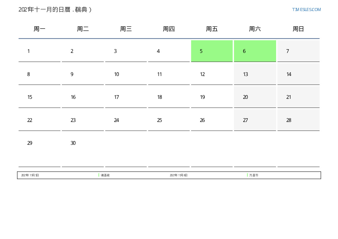 下載並打印2021年十一月瑞典節假日和周末的PDF日曆