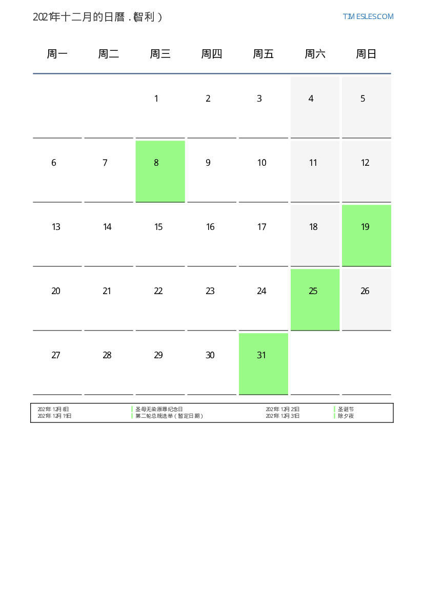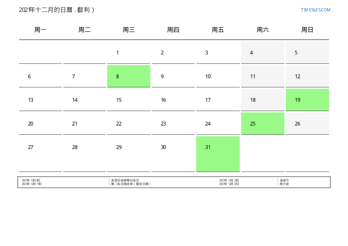 下載並打印2021年十二月智利節假日和周末的PDF日曆