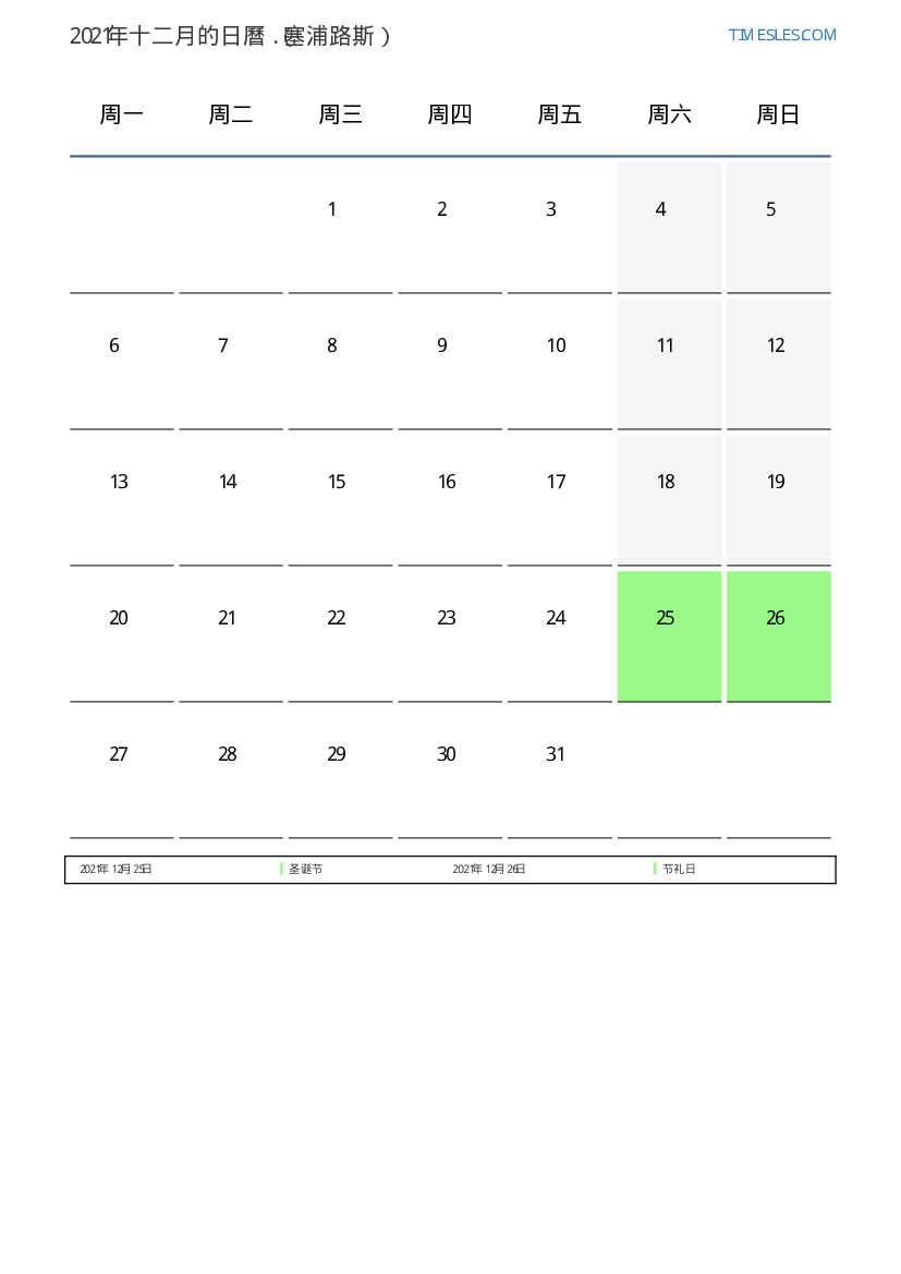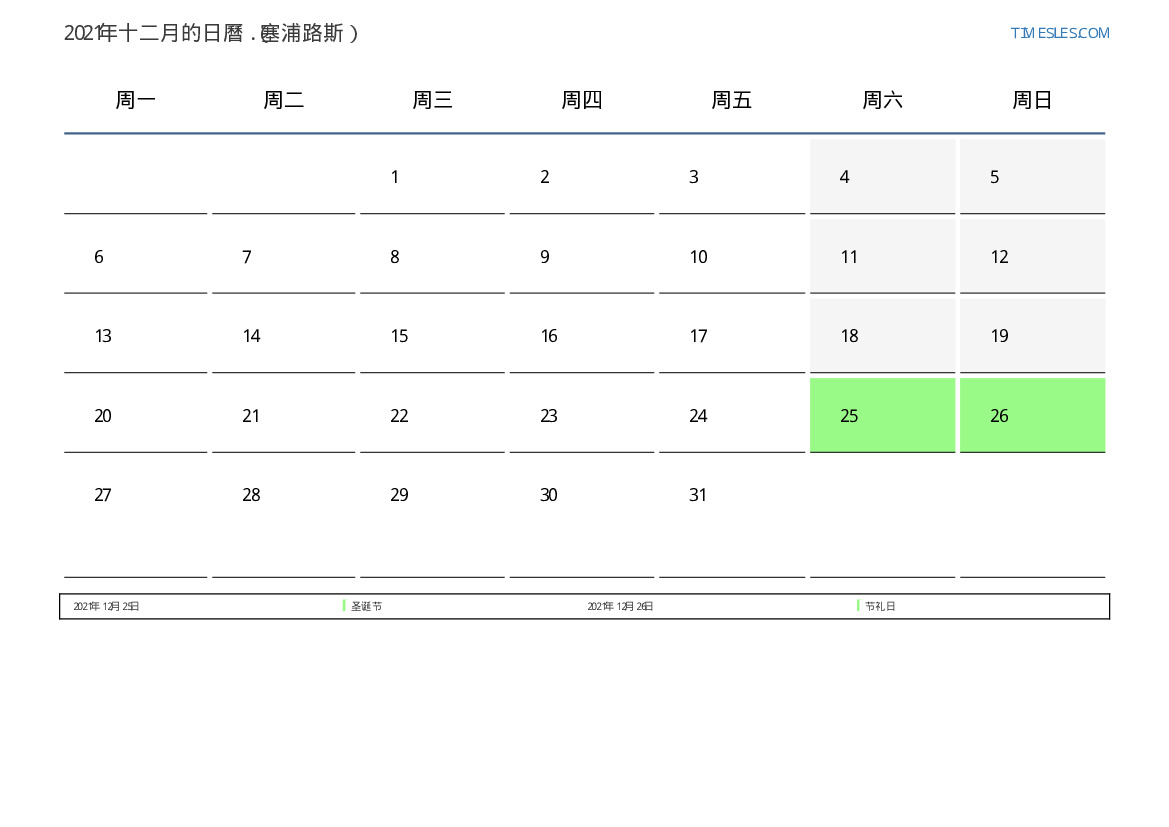 下載並打印2021年十二月塞浦路斯節假日和周末的PDF日曆