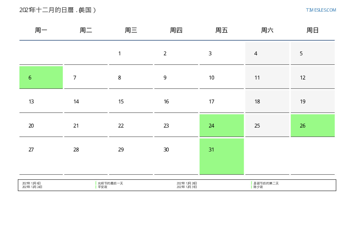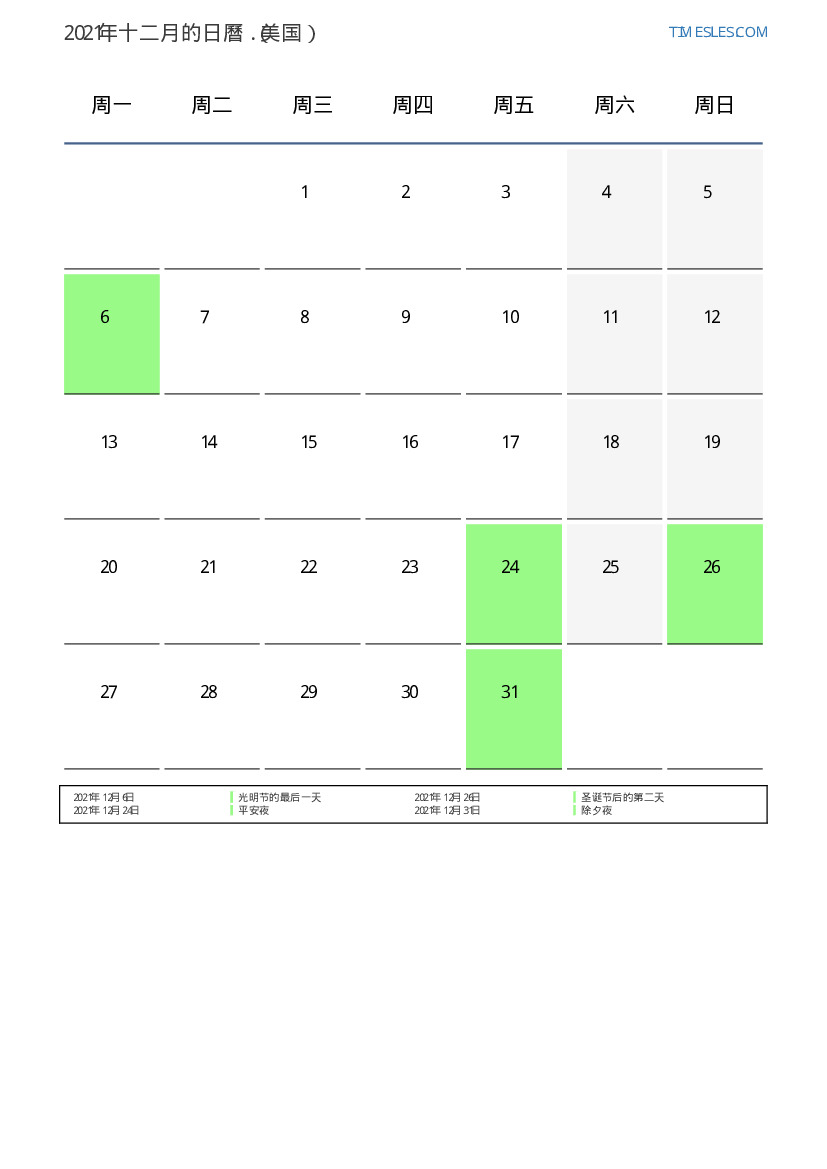 下載並打印2021年十二月美国節假日和周末的PDF日曆