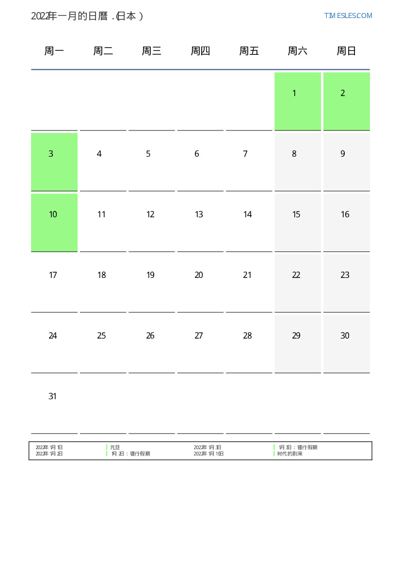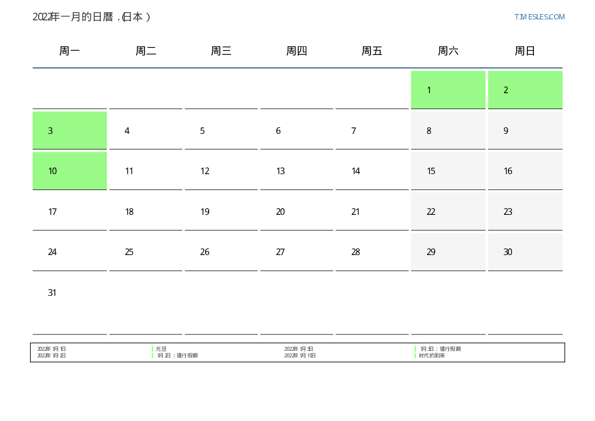 一月包含31天。 這是2022年的1個月。 在2022年一月,在日本有4 假期和休假。