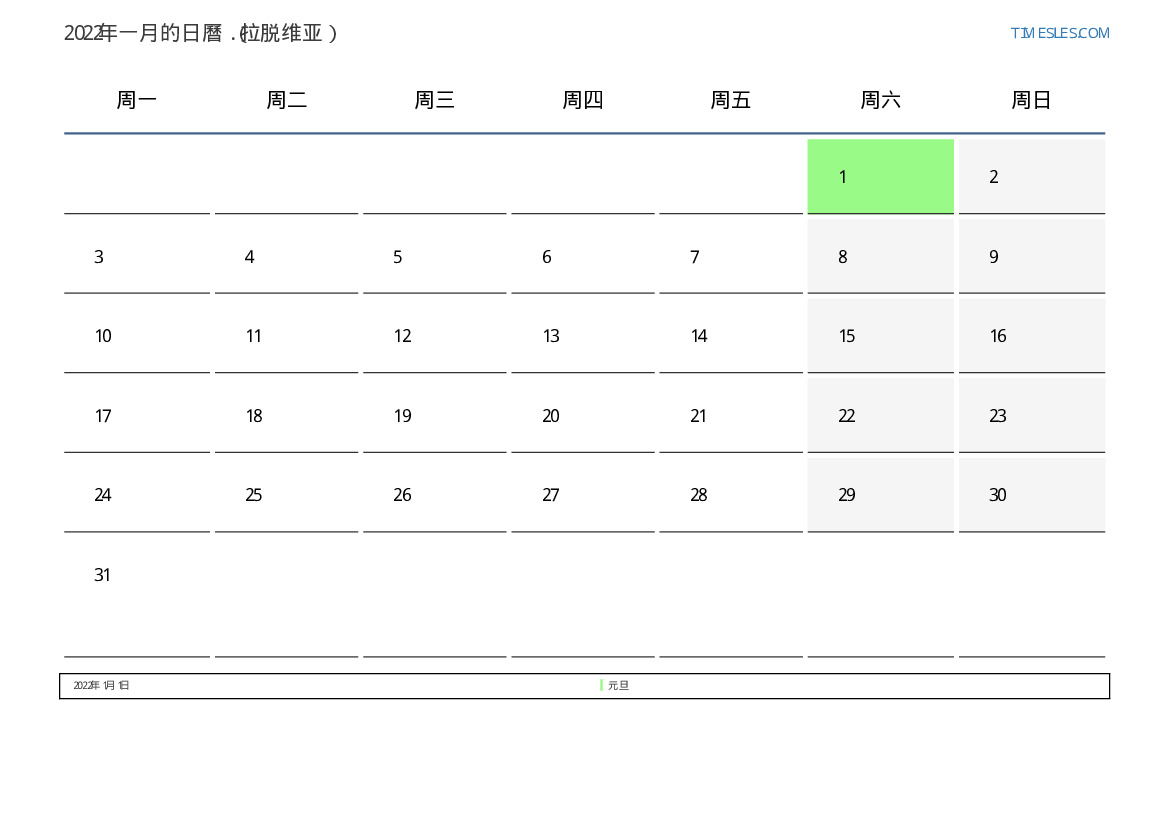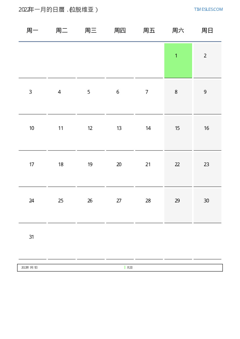 一月包含31天。 這是2022年的1個月。 在2022年一月,在拉脱维亚有1 假期和休假。