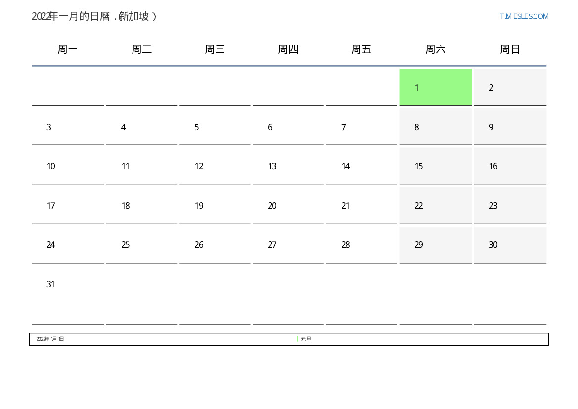 一月包含31天。 這是2022年的1個月。 在2022年一月,在新加坡有2 假期和休假。