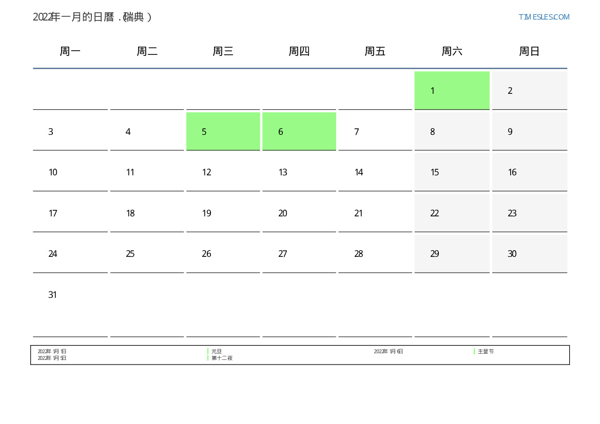 下載並打印2022年一月瑞典節假日和周末的PDF日曆