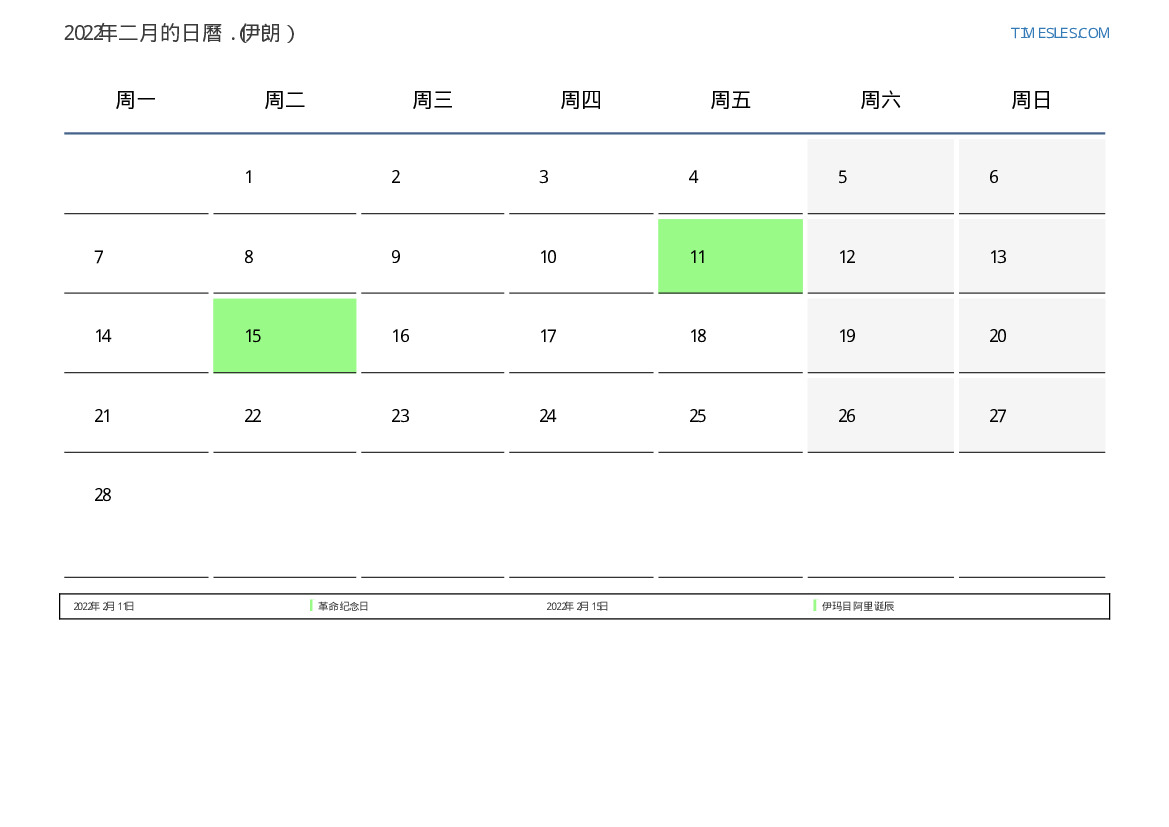 下載並打印2022年二月伊朗節假日和周末的PDF日曆