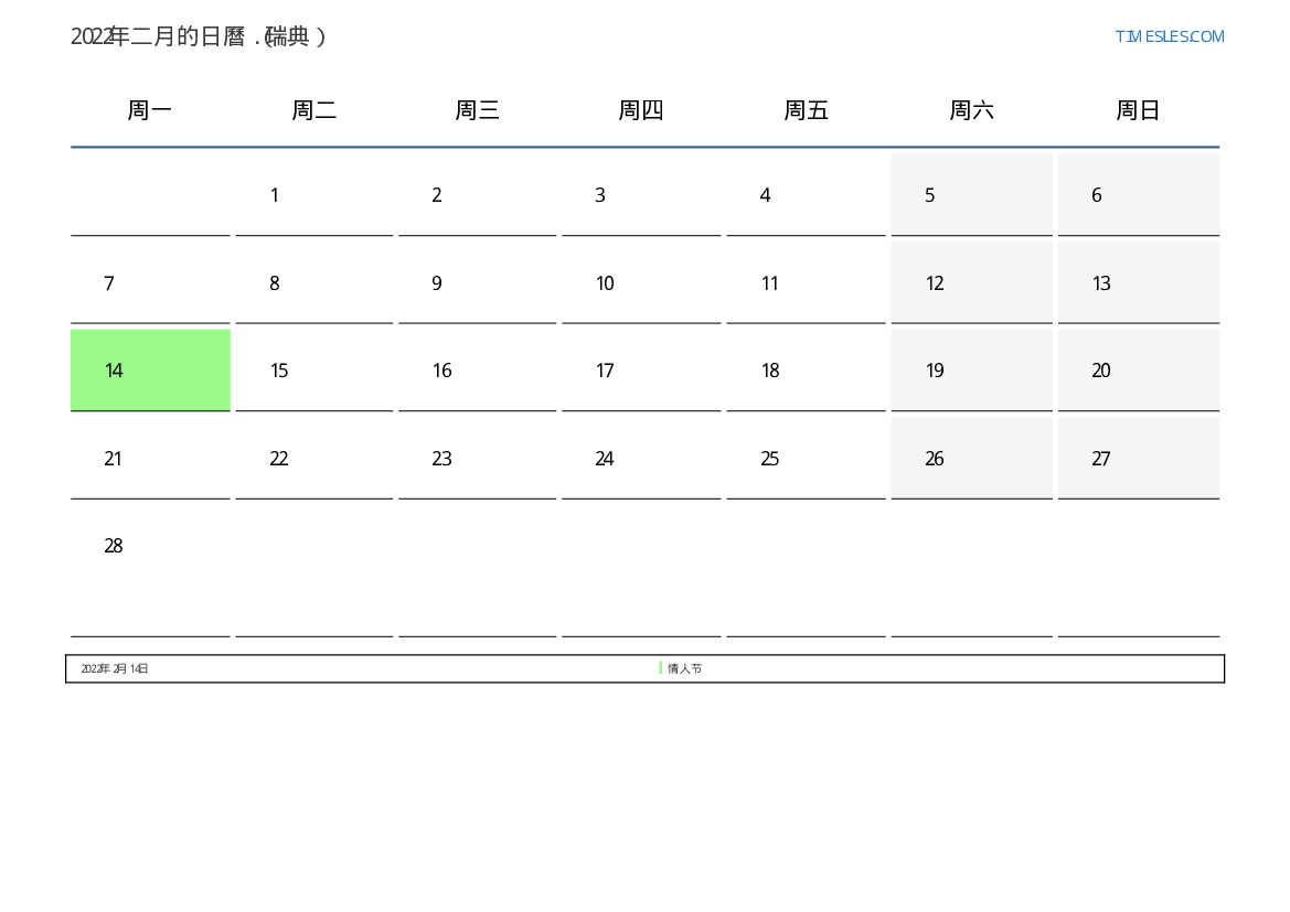 下載並打印2022年二月瑞典節假日和周末的PDF日曆
