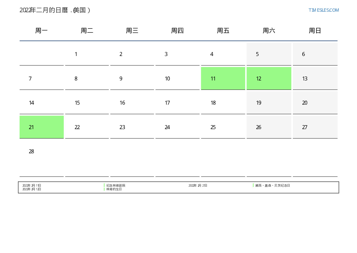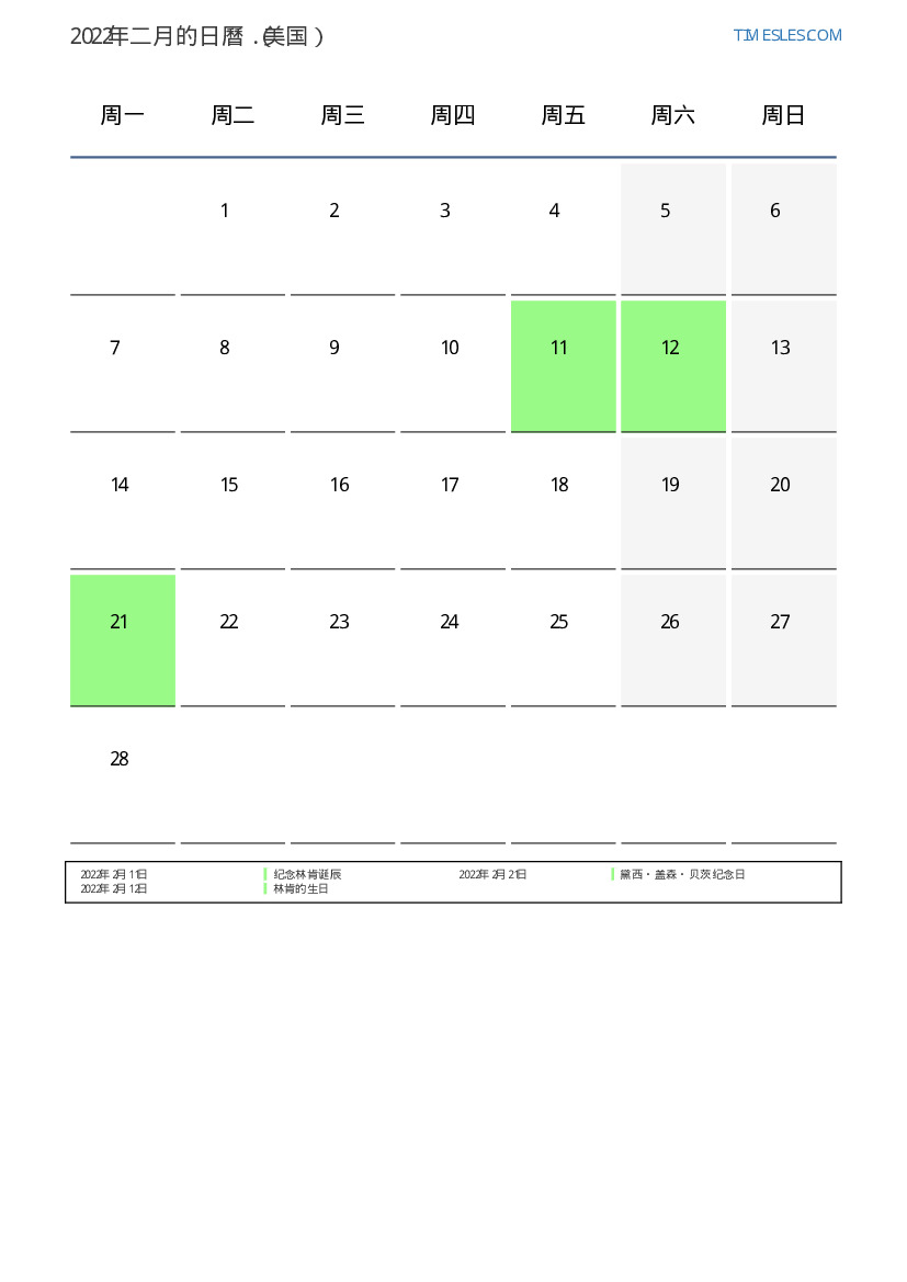 下載並打印2022年二月美国節假日和周末的PDF日曆