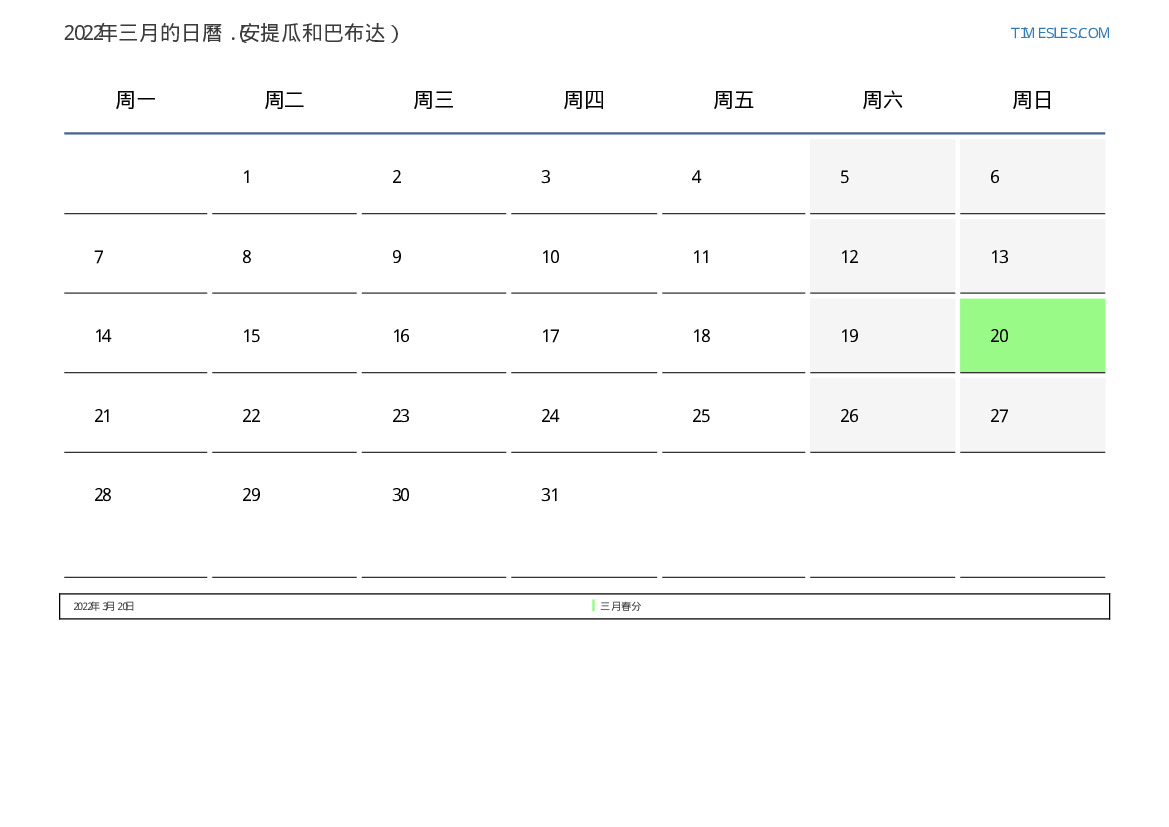 下載並打印2022年三月安提瓜和巴布达節假日和周末的PDF日曆