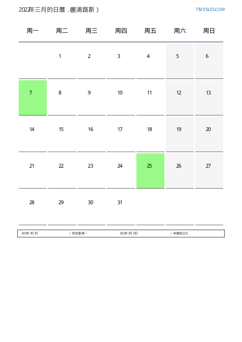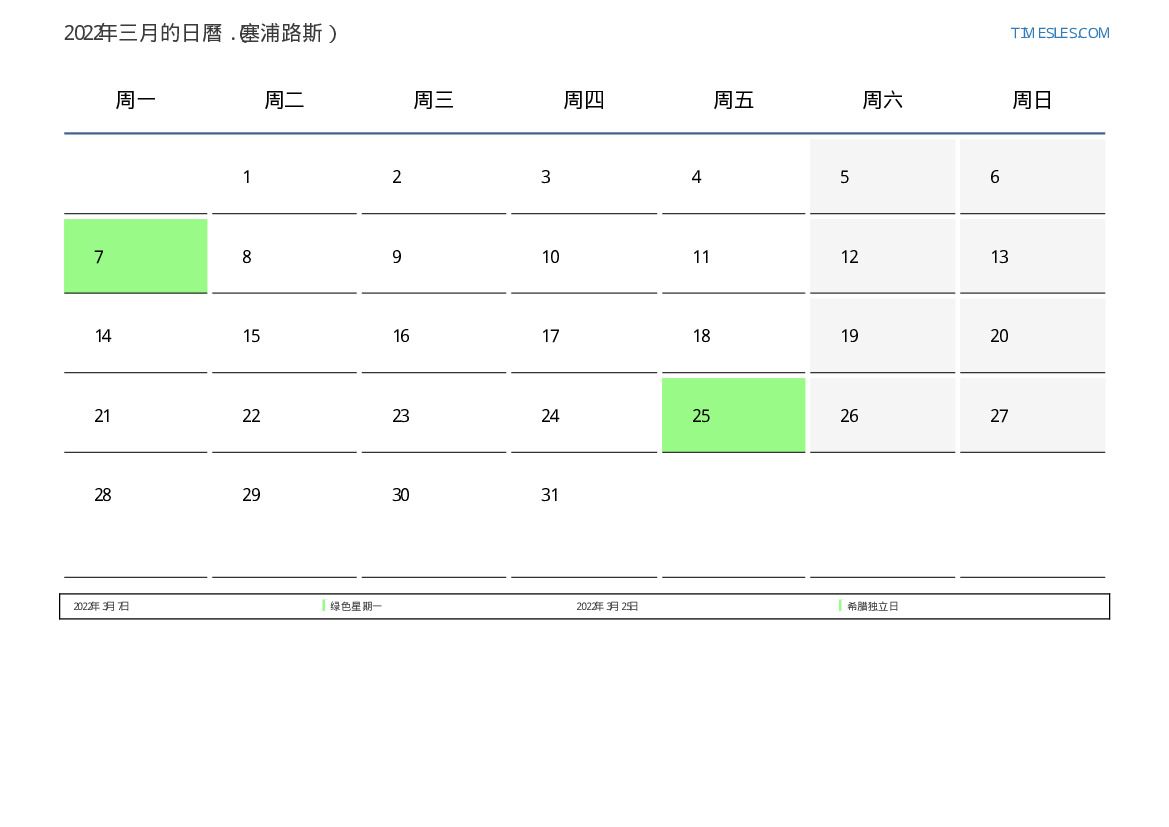 下載並打印2022年三月塞浦路斯節假日和周末的PDF日曆