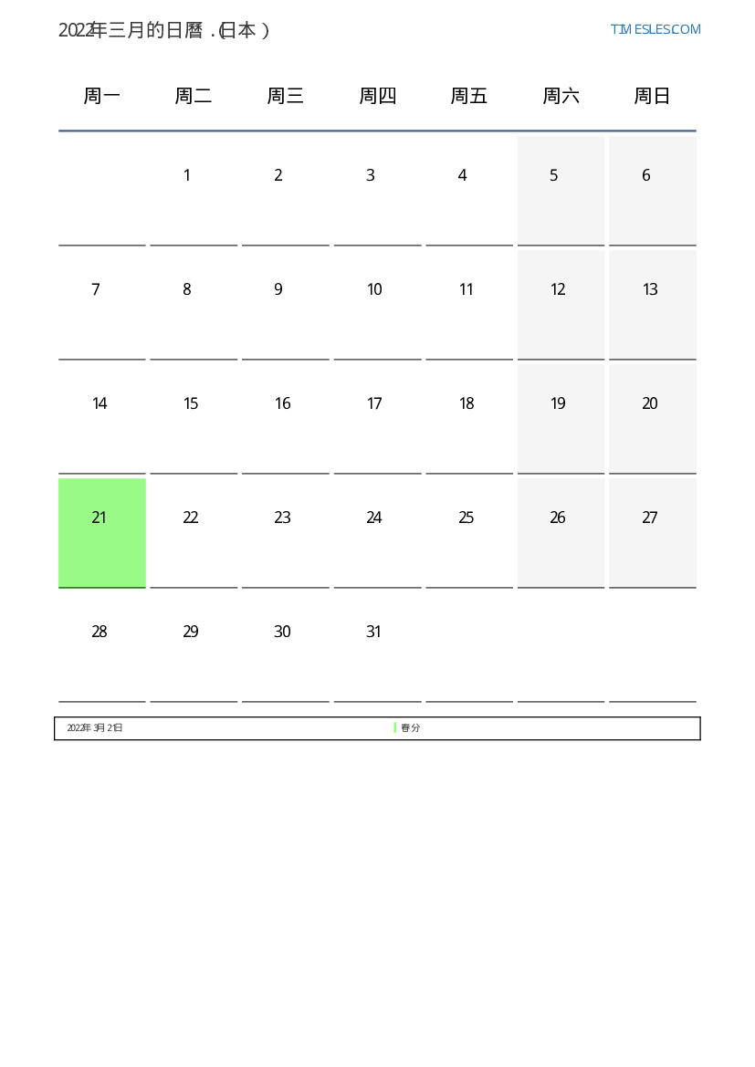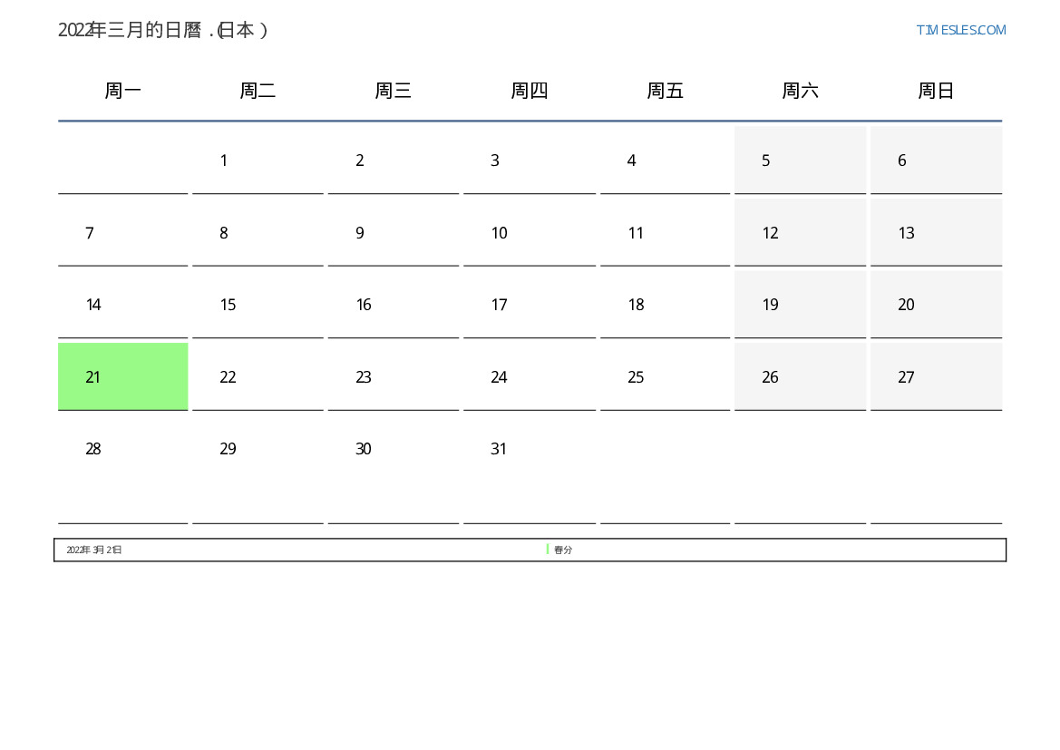下載並打印2022年三月对于日本節假日和周末的PDF日曆