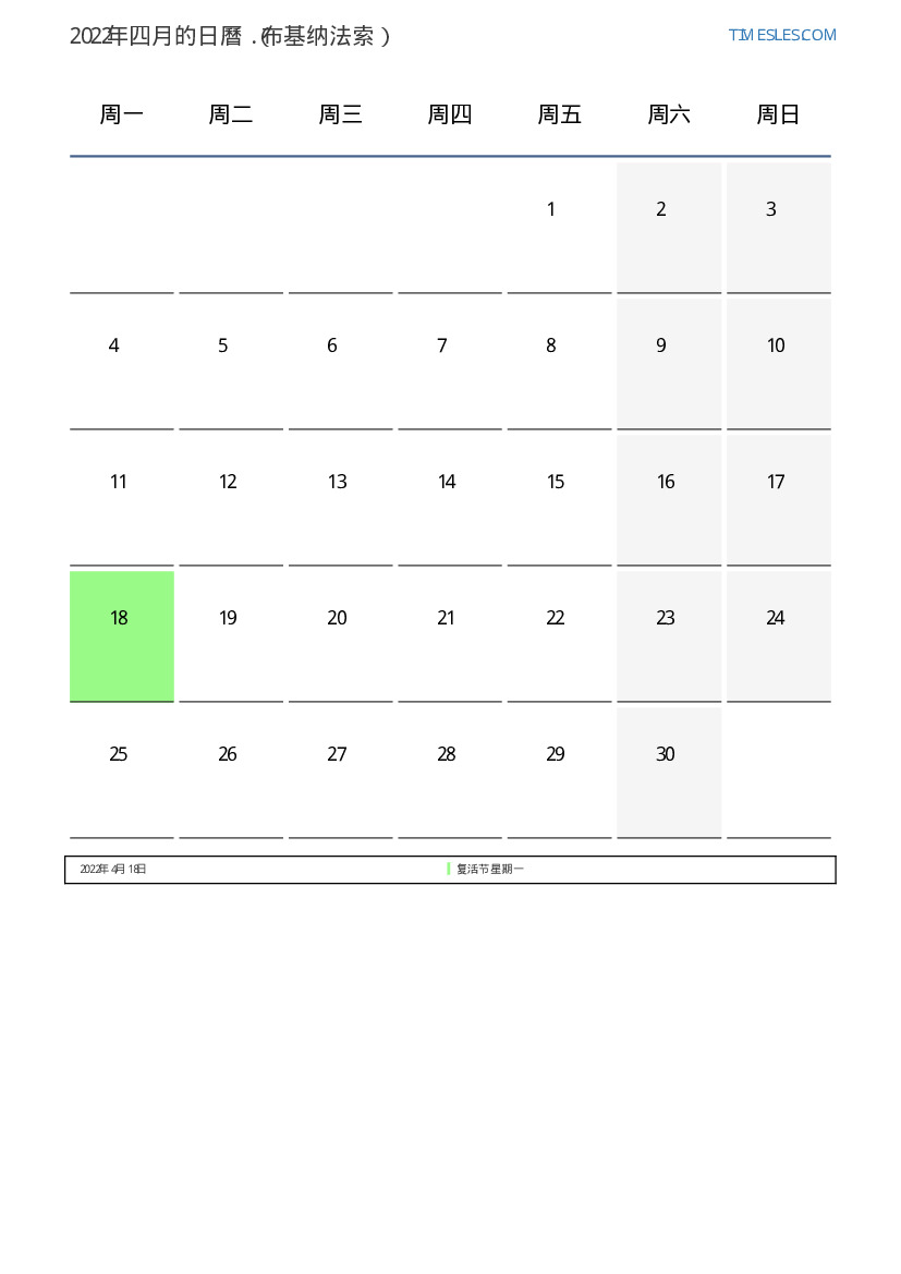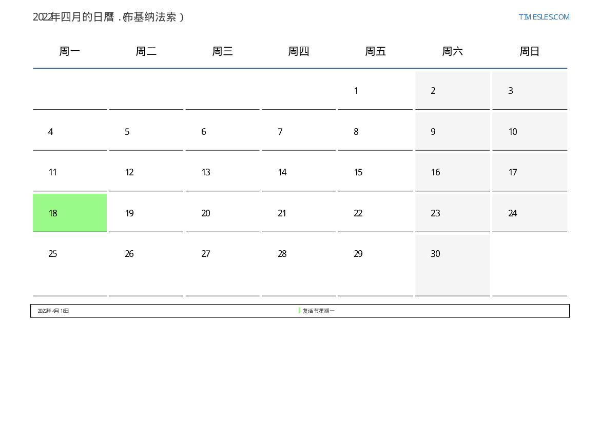 下載並打印2022年四月布基纳法索節假日和周末的PDF日曆