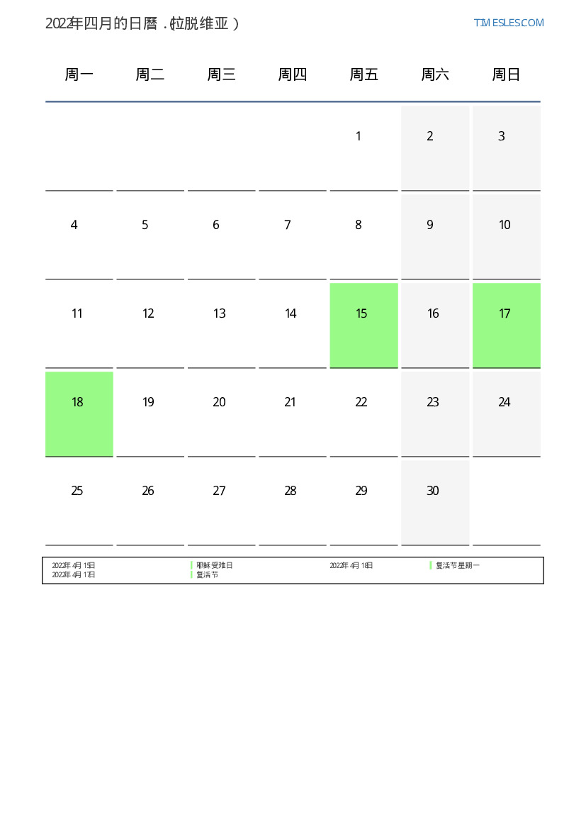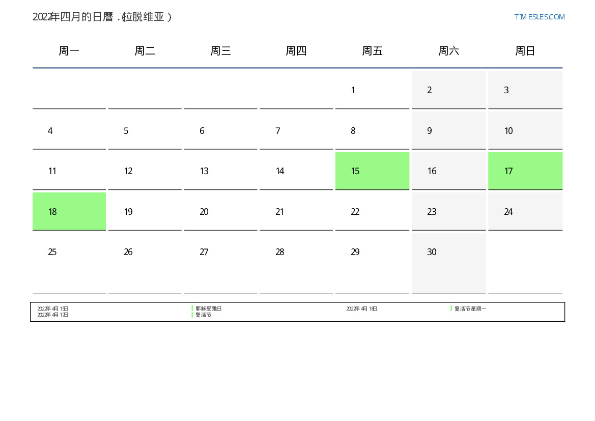 下載並打印2022年四月拉脱维亚節假日和周末的PDF日曆