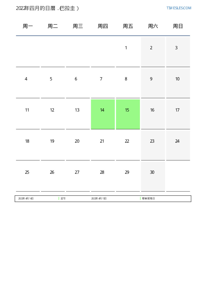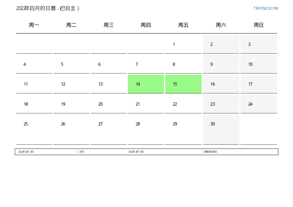 下載並打印2022年四月巴拉圭節假日和周末的PDF日曆