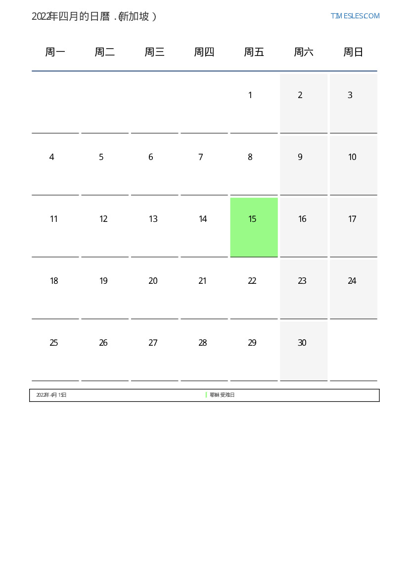 下載並打印2022年四月对于新加坡節假日和周末的PDF日曆
