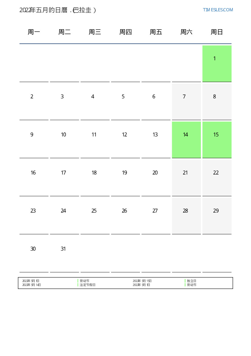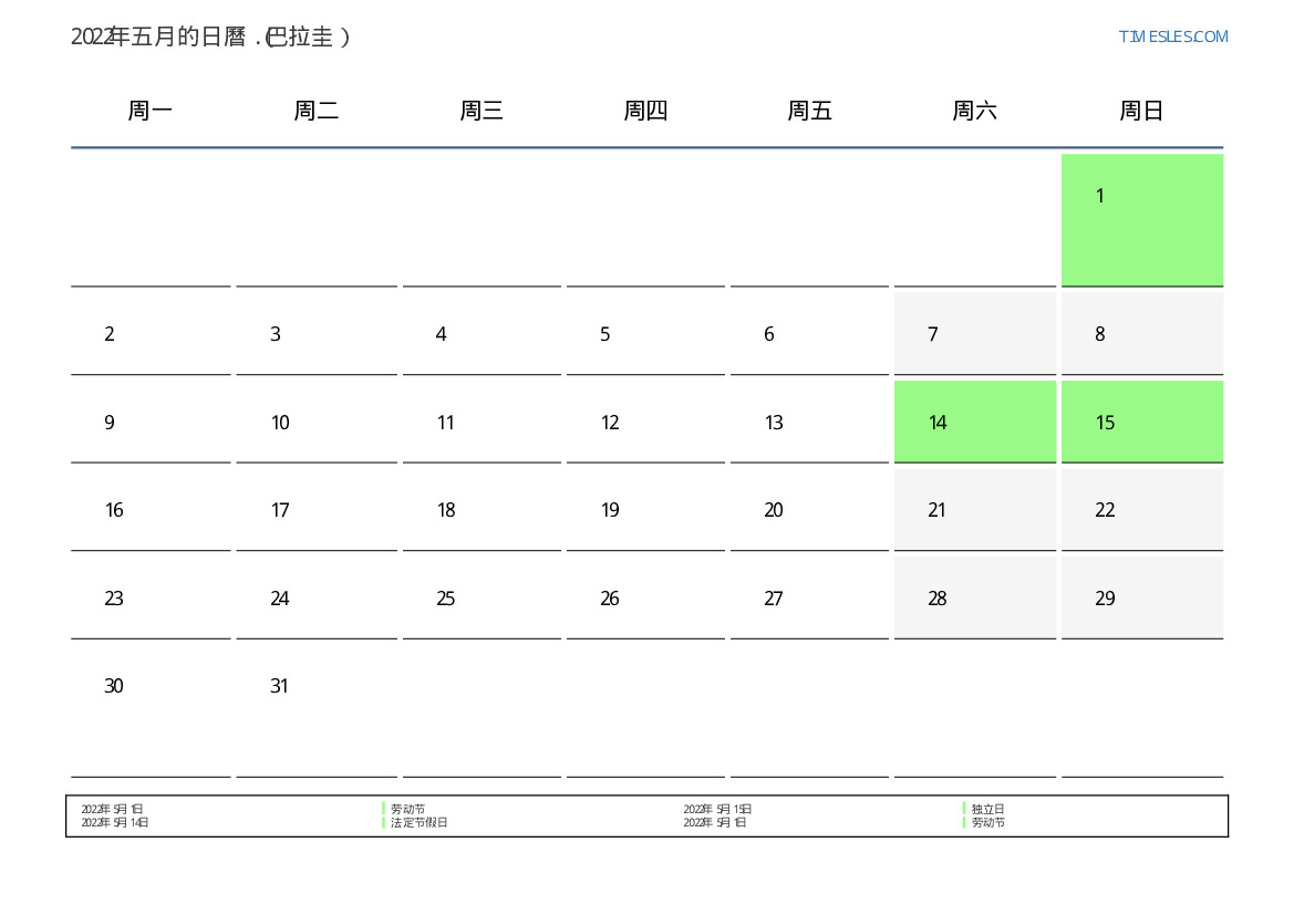 下載並打印2022年五月巴拉圭節假日和周末的PDF日曆
