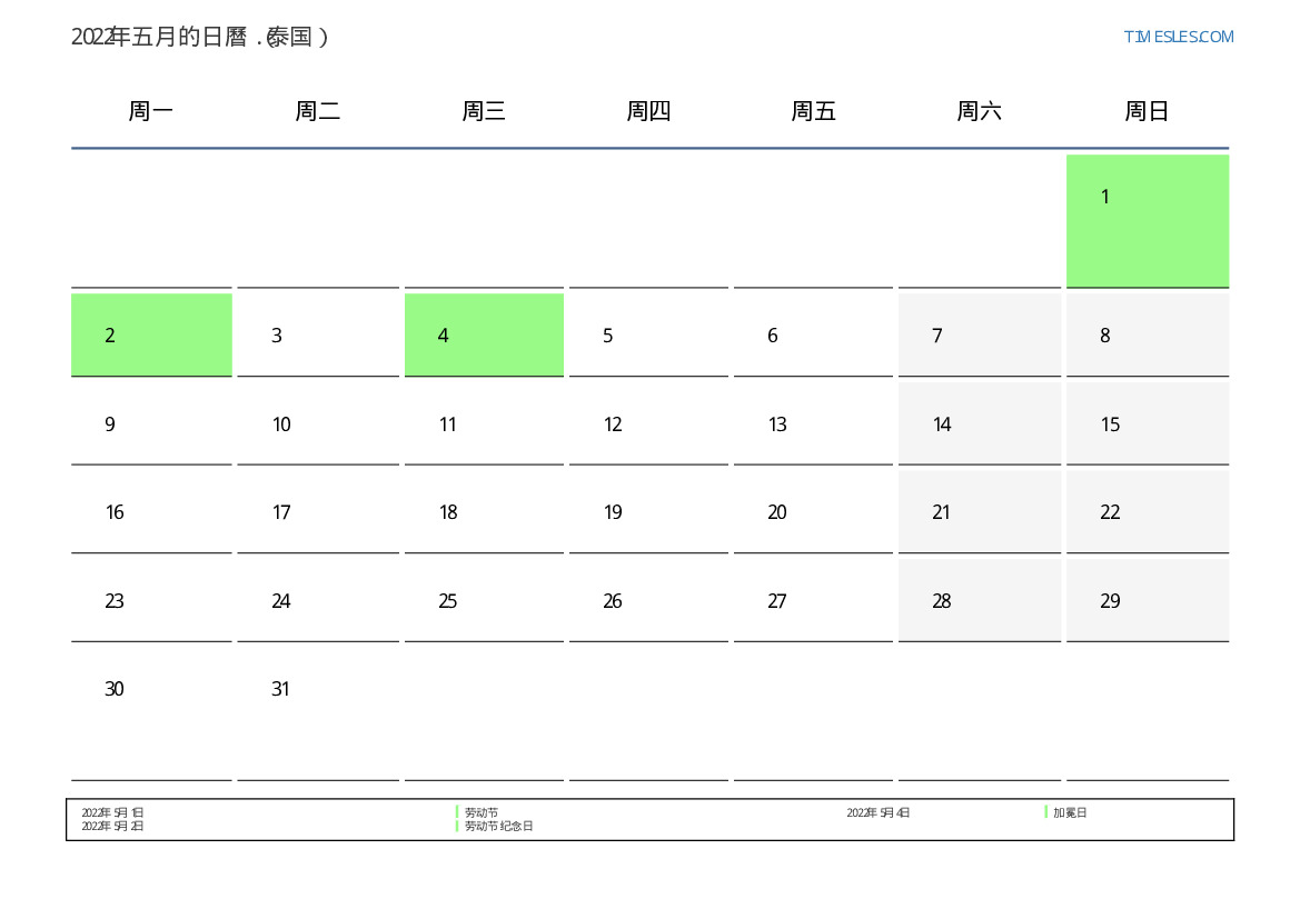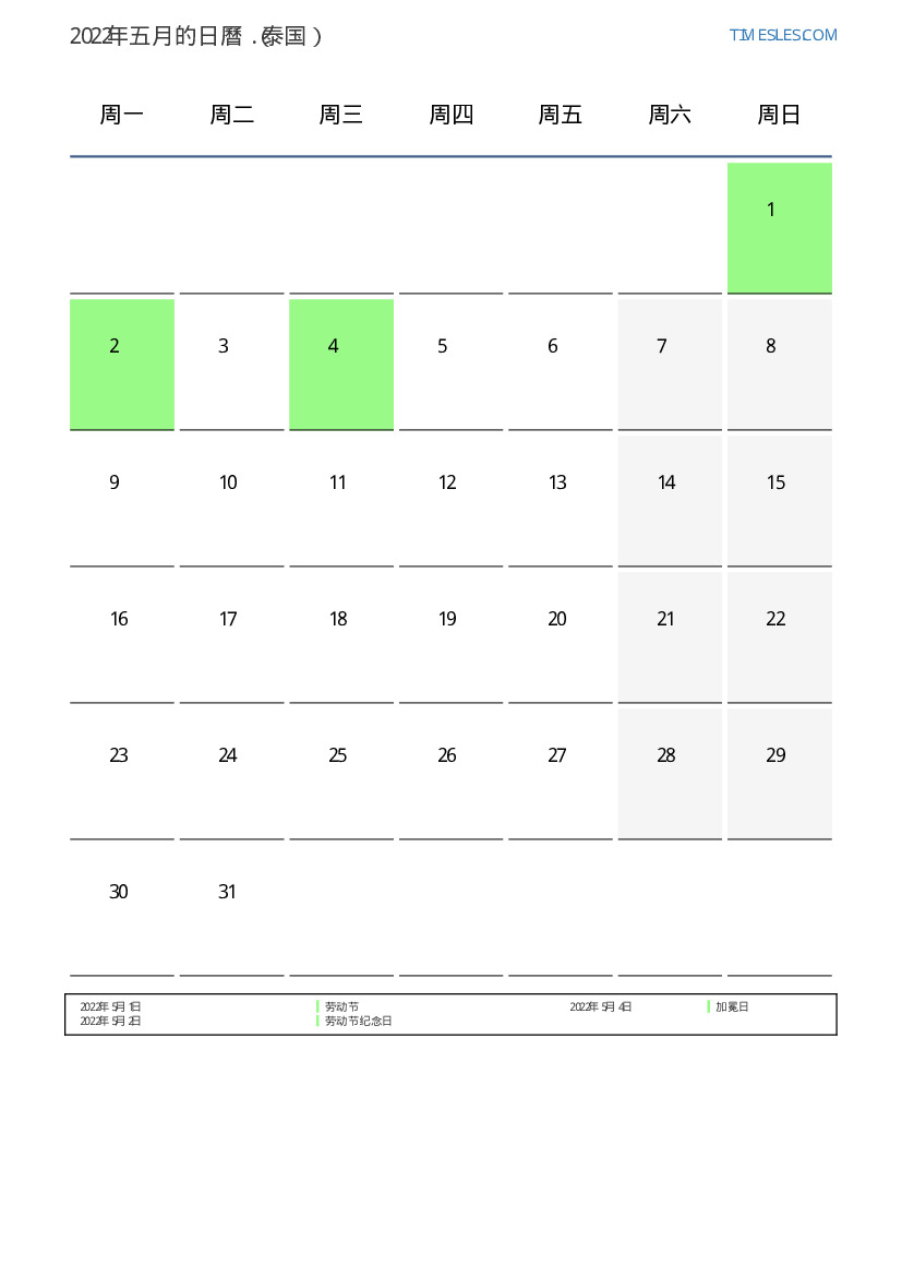 五月包含31天。 這是2022年的5個月。 在2022年五月,在泰国有3 假期和休假。