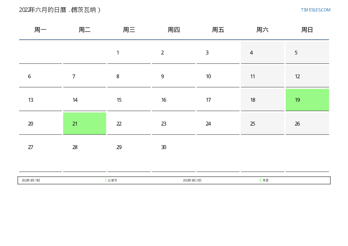 下載並打印2022年六月博茨瓦纳節假日和周末的PDF日曆