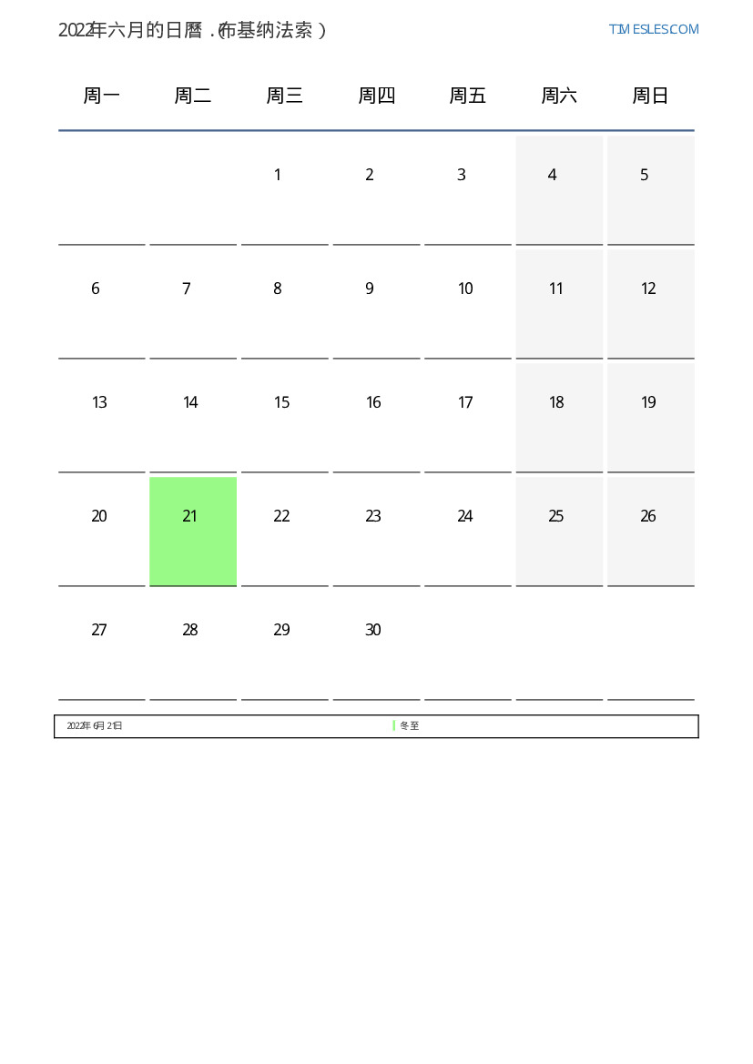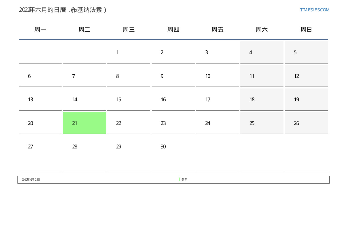 下載並打印2022年六月布基纳法索節假日和周末的PDF日曆