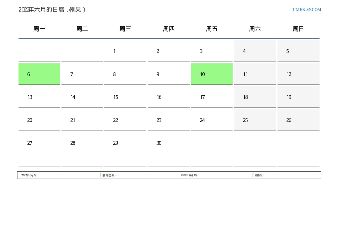 下載並打印2022年六月刚果節假日和周末的PDF日曆