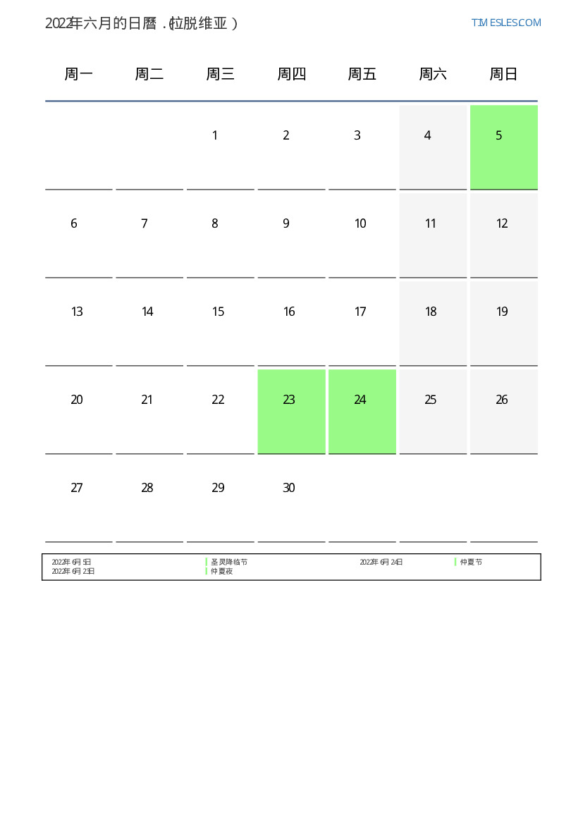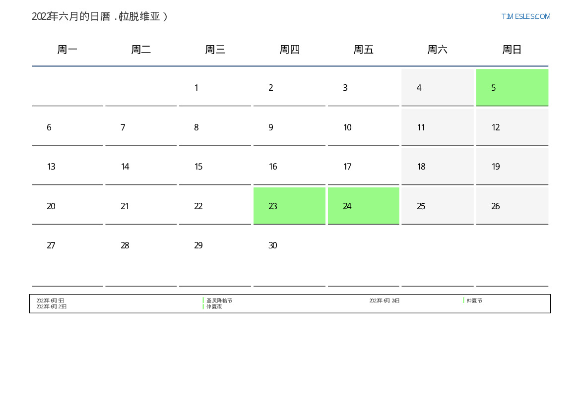 下載並打印2022年六月拉脱维亚節假日和周末的PDF日曆