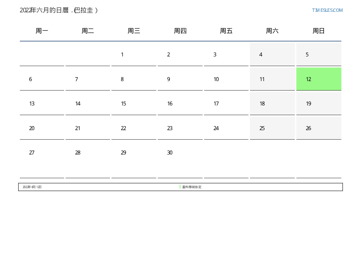 六月包含30天。 這是2022年的6個月。 在2022年六月,在巴拉圭有2 假期和休假。