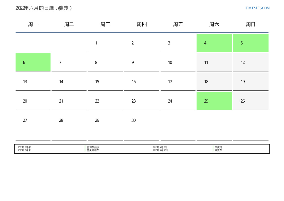 瑞典2022年六月日曆