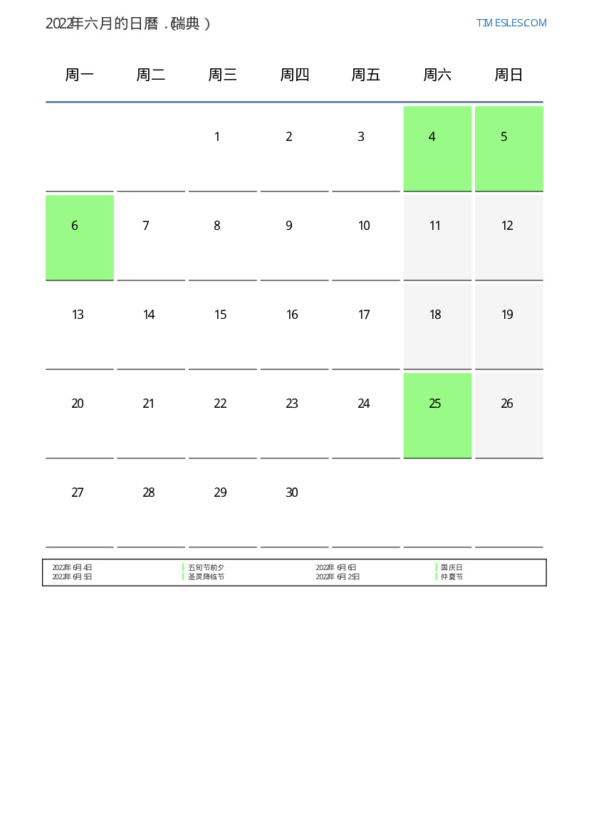 下載並打印2022年六月瑞典節假日和周末的PDF日曆