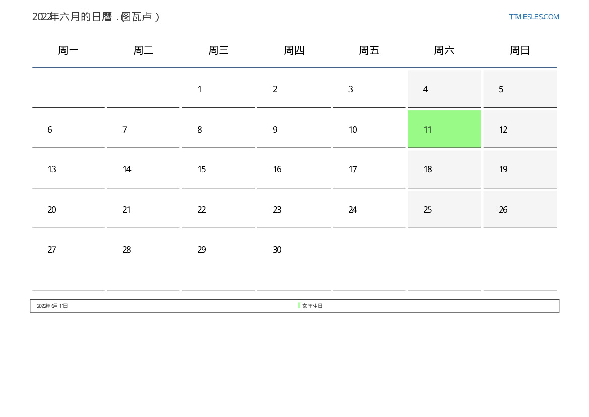 对于图瓦卢2022年六月的假期和周末日曆