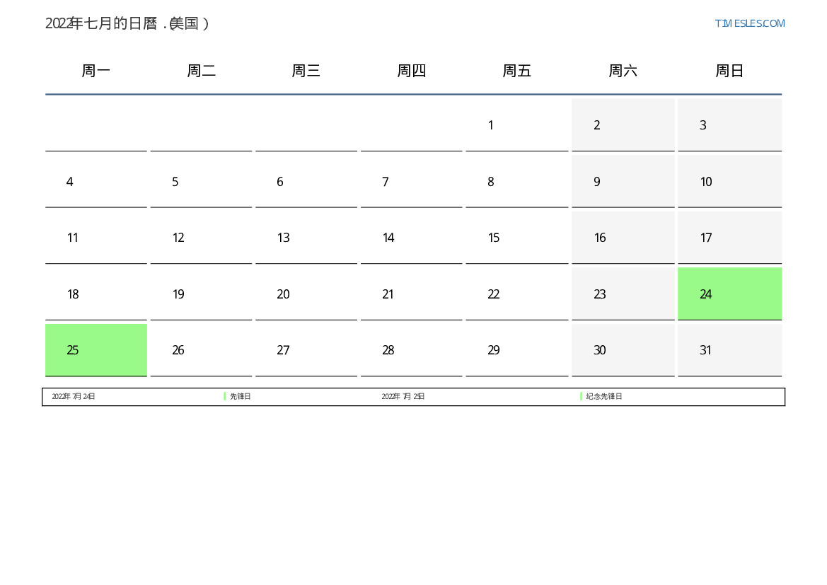 美国2022年七月日曆