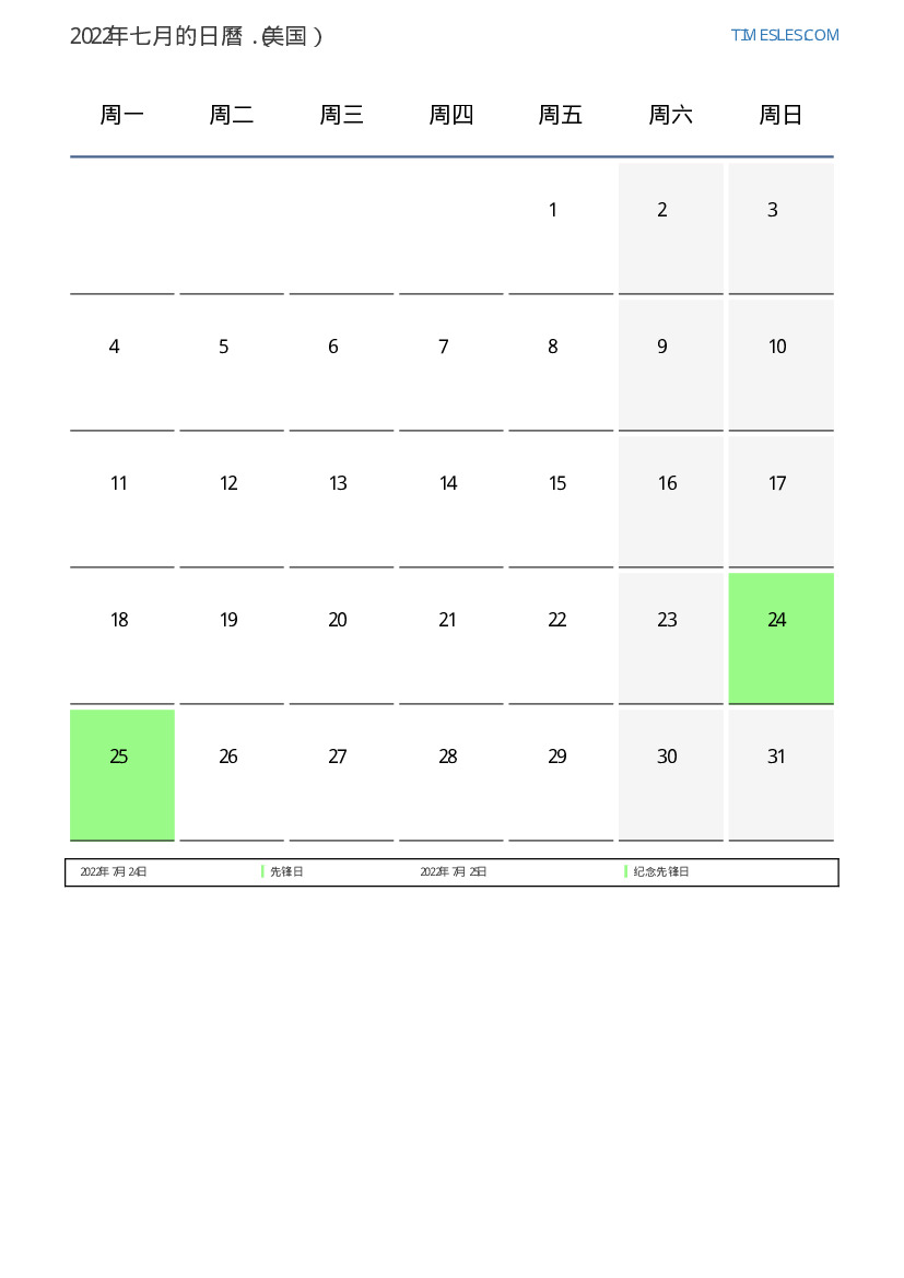 美国2022年七月的假期和周末日曆