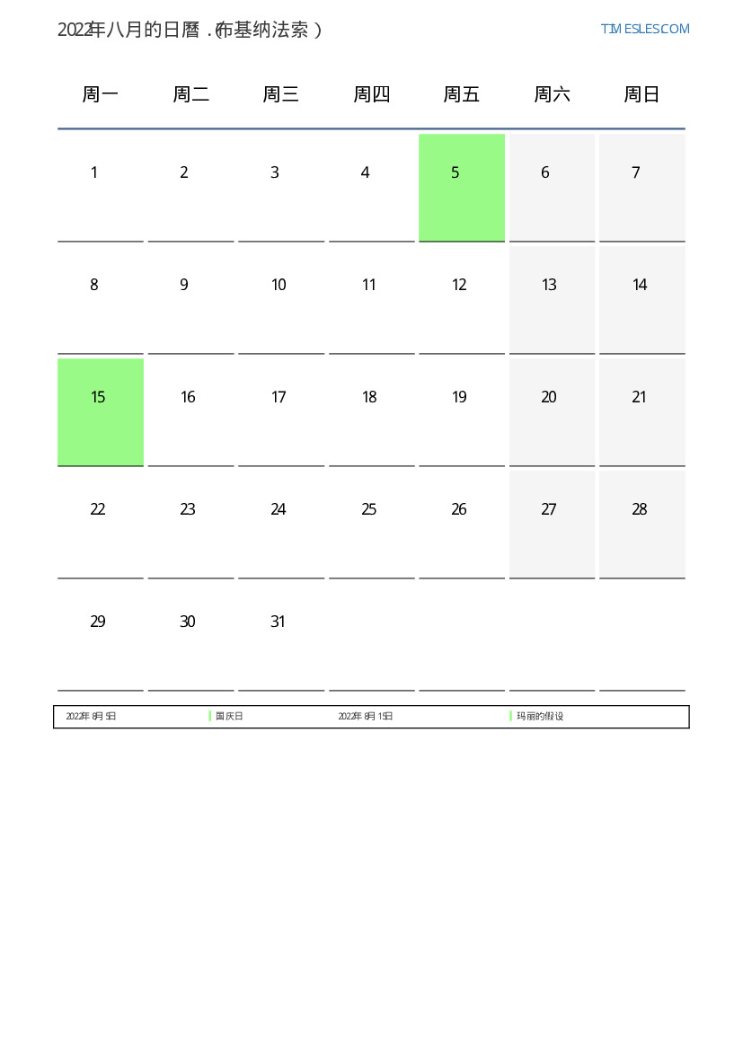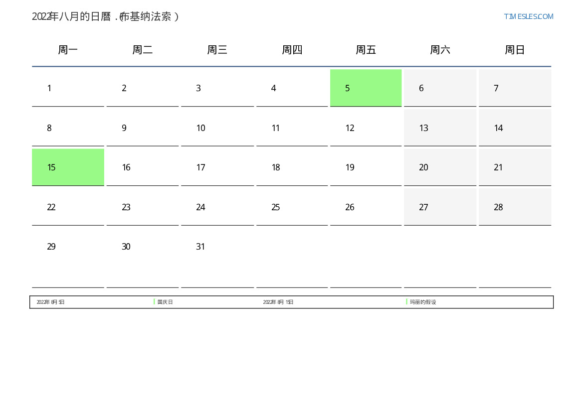 八月包含31天。 這是2022年的8個月。 在2022年八月,在布基纳法索有2 假期和休假。