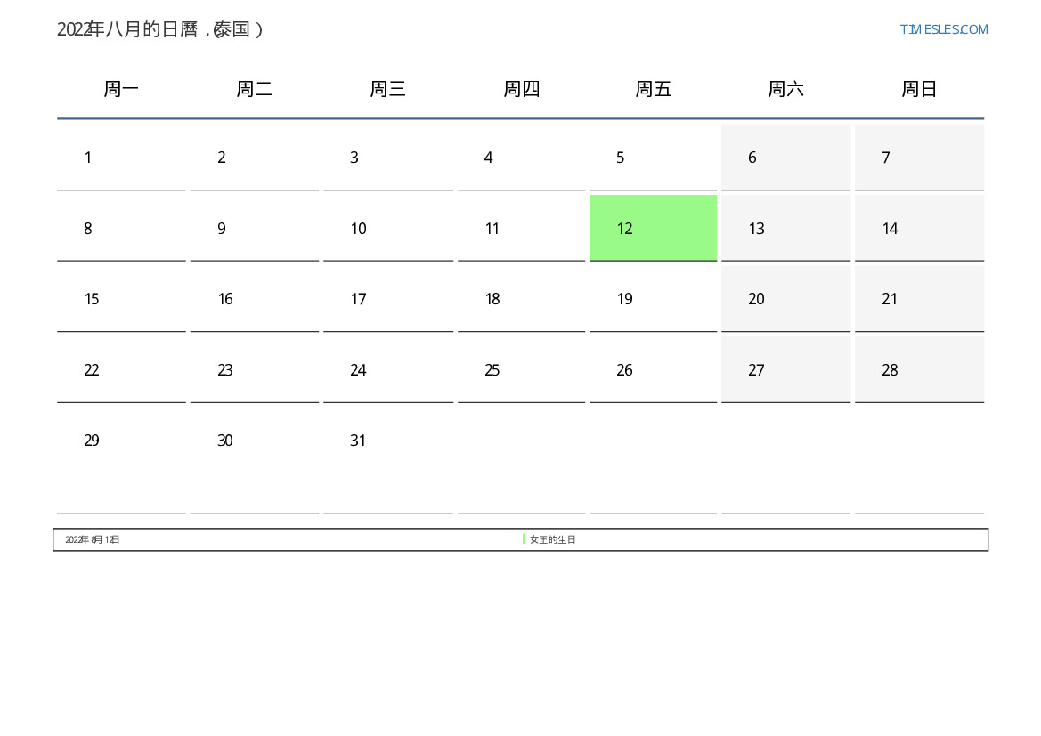 为泰国2022年八月日曆